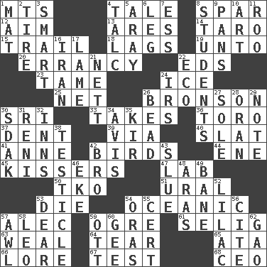 ACROSS 1. Mountains (abbr.) 4. Lie 8. Practice fight 12. Direct toward a target or goal 13. Ancient Greek god of war 14. Edible starchy tuberous root 15. Hang back 18. Straggles 19. To (old English) 20. Tendancy to err 22. Begley and Asner 23. Not wild 24. Frozen water 25. Fish or hair follower 26. "Death Wish" actor 30. Indian title of respect (Mr.) 33. Proceeds 36. "Corrida" creature 37. Scratch 39. By way of 40. Narrow board 41. Queen of England 1702-14 42. Avian creatures 44. Compass dir. 45. Smoochers 47. Experiment locale 50. Ring climax 51. Mountain range 53. Pass on 54. Pertaining to the sea 57. Actor Baldwin 59. Legendary monster 61. Major League Baseball Commissioner Bud 63. Welt 64. Pull apart 65. "One Day ___ Time" 66. Old wives' tales, e.g. 67. Trial 68. Corporate head (abbr.) DOWN 1. Floor covering 2. Hoop that covers a wheel 3. Don Adams' spy role 4. Baby powder 5. Like ___ of sunshine 6. Part of a journey 7. Double-curved letter 8. SAT takers 9. Zero-star reviews 10. Tate display 11. Friend of Pooh 16. SW Asia republic 17. Unable to walk 21. Remaining after all deductions 22. Environmental prefix 24. Big collection agency 26. Necklace unit 27. Not divided or shared with others 28. NW Algerian seaport 29. Musical sound 30. Neighbor of Neb. 31. Painter Guido (1575-1642) 32. Lodging establishments 34. Opinion 35. Apertif with cassis 38. A testis 42. Sis' sibling 43. Turn sharply 46. Make supply last 48. Caspian sea tributary 49. Object of repulsion 52. Pale purple color 53. Letter starter 54. Mouths or openings 55. Certainty 56. Quote 57. Leather borer 58. Lion 59. Baseball player Mel 60. Turn to the right 62. E Mali city