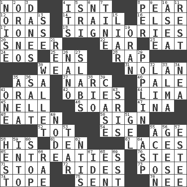ACROSS 1. Lower and raise head in agreement 4. Is not 8. Lightbulb-shaped fruit 12. Mouths or openings 14. Lag or linger behind 16. Otherwise 17. Charged particles 18. Seigniories (variant) 20. Contemptuous expression 22. Ewer handle 23. Erode 24. Greek goddess of the dawn 25. Followers of ems 28. Strike 30. Welt 31. Pitcher Ryan 35. White ___ sheet 37. Drug cop 40. Diluted with white 41. Taken by mouth 42. Off-Broadway awards 44. Pale green bean 45. 1994 drama film starring Jodie Foster 46. Fly high 47. _ tizzy (2 wds.) 48. Eroded 50. Omen 52. Small child 54. Compass dir. 55. Mature 58. Part of HMS, perhaps 61. Lair 63. Shoestrings 65. Pleas 70. Proofreading order 71. Portico 72. Amusement-park features 73. Introduce or present, as a question 74. Drink excessively 75. Emitted 76. Born DOWN 1. Annoying sound 2. U. of Maine site 3. Natives or inhabitants of Denmark 4. It is 5. _ Lanka 6. Tired old horse 7. Prong on a fork 8. For each 9. Writer Wiesel 10. Toward the sea 11. Remainder 13. Compass dir. 15. One who doesn't tell the truth 19. Northwest Algerian city 21. To riddle 26. Billionth: prefix 27. Broad, flat, thick pieces 29. Cotton for raincoats, e.g. 30. Place for singles 32. (Had) reclined 33. _ mater 34. Teachers' org. 35. Type of rug 36. Table seasoning 38. River (Sp.) 39. Stop 41. Single 43. Indian titles of respect 49. Thickened enlargement 51. Set 53. Rend 55. NE Massachussets city 56. Honkers 57. First name in cosmetics 58. Behest 59. To the inside or interior of 60. Discontinue 62. Nuclear Threat Initiatives 64. Cleo's killer 66. Actress Charlotte 67. Binary compound 68. Car or cant ending 69. Fast jet (abbr.)