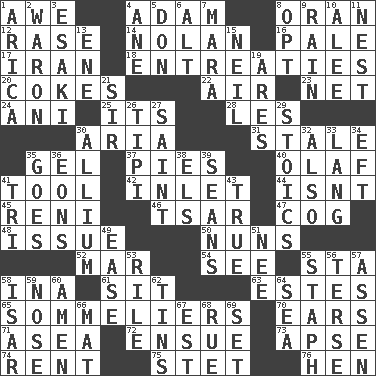 ACROSS 1. Deep reverence 4. First of billions? 8. Northwest Algerian city 12. Raze (variant) 14. Pitcher Ryan 16. Diluted with white 17. SW Asia republic 18. Pleas 20. Popular sodas 22. Atmosphere 23. Fish or hair follower 24. Black tropical American cuckoo 25. ___ a Wonderful Life 28. French article 30. Operatic vocal solo 31. Lacking originality or spontaneity 35. Set 37. Sliced desserts 40. Norwegian king 41. Implement 42. An arm off of a larger body of water 44. Is not 45. Painter Guido (1575-1642) 46. Russian ruler of old 47. Gear tooth 48. Come out of 50. Religious women 52. Spoil 54. Observe 55. R.R. building 58. _ tizzy (2 wds.) 61. Be seated 63. _____ Park, CO 65. Wine waiters 70. Hearing organs 71. At sea 72. Follow as a consequence or result 73. Domed church section 74. Monthly bill 75. Proofreading order 76. Layer DOWN 1. N. Chile seaport 2. Make _____ (do battle with) 3. 1973 Nobel Price Winner (Physics) Leo 4. One (Scot) 5. Spanish title 6. The first octave above the treble staff 7. Hindu Mythology: god of death 8. Choose 9. Water falling in drops from the sky 10. Toward shelter 11. A home for chicks 13. Compass dir. 15. Famous astronaut Armstrong 19. Ancient Greek god of war 21. Title for a knight 26. Native american tent (variation) 27. Virtuous person 29. Unemotional ones 30. Plant genus of onion and garlic 32. In addition 33. Long (Scottish) 34. Newt 35. Travels 36. Immeasurably long periods of time 38. Raised railways 39. Seines 41. Three (prefix) 43. Loyal 49. Relaxation 51. Born 53. Cause heat under the collar 55. Staphylococcus 56. Laconic 57. NE Netherlands city 58. Austrian river, tributary to the Danube 59. Characteristic smell of wine 60. So be it 62. Airtight sealed metal containers 64. Ocean 66. Floor protector 67. Eastern Standard Time (abbr.) 68. Regret 69. Arrange properly for use