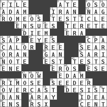 ACROSS 1. Do some clerical work 5. Had dinner 8. Bear (Spanish) 11. First man 12. SW Asia republic 13. Tired old horse 14. Lover boys 17. One of the two male reproductive glands 19. Takes place subsequently 21. Cigar-shaped 22. South Vietnam president (1954) 23. Epoch 24. Plant excrement 27. Snake ____ (dice throw) 29. Numbers guy (abbr.) 32. Bodily heat indicating an inflammation 34. To separate or throw off 36. Wither 37. Northwest Algerian city 38. Separate the seeds from cotton 39. Indian skirt 40. Musical sound 41. Eastern Standard Time (abbr.) 42. Trials 43. Compass dir. 44. Greek god of love 46. Compass dir. 47. Immediately 50. Dutch treat 52. Full of chinks, cracks, or crevices 55. Sowing specialist 57. Cloudy 59. Cease 62. Forbid 63. Like ___ of sunshine 64. It may be bright or harebrained 65. Followers of ems 66. Acura sports coupe 67. Penny DOWN 1. Distant 2. Wedding promise 3. Unable to walk 4. Make improvements or corrections to 5. "We ___ not amused" (Victoria) 6. Clothes sense 7. Keyboard key 8. Single time 9. Table seasoning 10. Double curve, resembling the letter S 12. ___ a Wonderful Life 15. Flexible twig of a willow tree 16. Chop _ 18. Retirement account (abbr.) 20. Develop 24. Biscuitlike quick bread 25. Composer Copland 26. Food holder 28. Gospel singer Marvin 29. Stop 30. Actors' quests 31. Originate 33. Single 35. Main course 36. Compass dir. 42. Sadhe (variant) 45. Wrote a lyric poem 47. And not 48. Witty Wilde 49. Erodes 51. Of or pertaining to a meson 52. Loose flowing garment 53. _ the terrible 54. Not women's 55. Filthy place 56. Travel on or in a vehicle 58. Saxophone 60. Elected rep. 61. Make lace