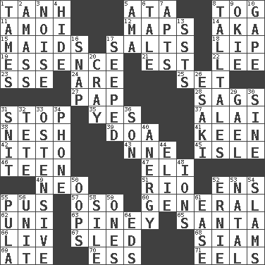 ACROSS 1. Hyperbolic tangent 5. _ moment's notice (2 wds.) 8. Coat; cloak 11. Mine, in Marseilles 12. Atlas contents 14. Alias (abbr.) 15. Women servants 17. Table seasonings 18. Mouth edge 19. Center 21. Eastern Standard Time (abbr.) 22. Area sheltered from the wind 23. Compass dir. 24. "We ___ not amused" (Victoria) 25. Arrange properly for use 27. Infant food 28. Settles 31. Constrict 35. Affirmative reply 37. Mountain range southwest of Kyrgyzstan 38. Soft 39. ___ good deed 41. Peachy ____! 42. "Tell ____ the Marines!" 43. Compass dir. 45. Small island 46. Adolescent 47. Connecticut Ivy Leaguer 49. Modern: prefix 51. River (Sp.) 52. Followers of ems 55. Tenth month of the Hindu calendar 57. Bear (Spanish) 60. Commissioned military rank 62. University (slang) 63. Abounding in pines 65. Before Barbara or Clara 66. 54 in ancient Rome 67. Downhill vehicle 68. Thailand, formerly 69. Had dinner 70. Double-curved letter 71. Snakelike fish DOWN 1. Makes less strong or intense 2. Collect or gather 3. Annoying sound 4. Flintstone garb 5. Nursemaid (var.) 6. Story 7. Tenement units (abbr.) 8. Baron Munchausen's specialties 9. Migrant worker of the '30s 10. Open wide 13. Fast planes 16. Fastener 17. Oozed 20. Supercomputer manufacturer 26. 1973 Nobel Price Winner (Physics) Leo 29. Highlander 30. Trig term 31. In a ____ (agitated or irritated) 32. False hair 33. Clearly or manifestly demonstrative 34. Give a jingle 36. Male child 40. Disorder of the immune system 44. Writer Wiesel 48. Charged particles 50. I made a mistake 52. Bert's buddy 53. Brizilian seaport 54. Hits or strikes with great force 55. Monetary unit of Botswana 56. A single undivided whole 58. Filth; sediment 59. Singles 61. Comfort 64. Begley and Asner