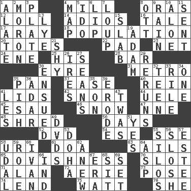 ACROSS 1. Electrical Unit 4. Place where flour is made 8. Mouths or openings 12. Hang loosely or laxly 14. Goodbye (Sp.) 16. Lie 17. Like ___ of sunshine 18. Census information 20. Hauls 22. Groovy apt. 23. Fish or hair follower 24. Compass dir. 25. Part of HMS, perhaps 28. Long, evenly shaped piece 30. Jane of fiction 31. Paris' subway 35. Baking dish 37. Relaxation 40. It's straight from the horse's mouth 41. Flaplike coverings 42. Derisive sound 44. Ubangi River tributary 45. Son of Isaac 46. Overwhelm 47. Compass dir. 48. Tear up 50. 24-hour periods 52. Movie disc 54. Compass dir. 55. Compass dir. 58. RI univ. 61. ___ good deed 63. Travel by water 65. Innocence, gentleness, or tenderness 70. Slit 71. Actor Alda or Thicke 72. Nest on high 73. Airs 74. Grant temporary use of 75. Electrical Unit 76. A female animal or person DOWN 1. Having winglike extensions 2. Person of subnormal intelligence 3. Food holder 4. Atlas unit 5. Wedding promise 6. Mouth edge 7. Central Nebraska county 8. Baseball player Mel 9. Water falling in drops from the sky 10. Medicinal plant 11. Transmitted 13. Potassium hydroxide 15. Thick slice 19. First man 21. Like a shrinking violet 26. Angers 27. Seines 29. Summer TV shows 30. Followed as a consequence or result 32. Adolescent 33. Cause heat under the collar 34. Single 35. Expression of disdain 36. The sixth month of the Jewish calendar 38. Male offspring 39. Wear away 41. French article 43. It was, poetically 49. Movie discs 51. It is so 53. Capital of the state of Qatar 55. Grain storage towers 56. Splash clumsily 57. First name in cosmetics 58. Allodial 59. Hero or heavy, e.g. 60. _ the terrible 62. Afresh 64. Cleo's killer 66. Indiana (abbr.) 67. Epoch 68. Be seated 69. Arrange properly for use