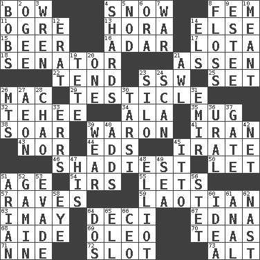 ACROSS 1. Arrow shooter 4. Overwhelm 8. Opposite of masc. 11. Legendary monster 13. Israeli folk dance 14. Otherwise 15. Fermented drink made from hops 16. The sixth month of the Jewish calendar 17. Globular water bottle used in Asia 18. Legislator 21. NE Netherlands city 22. Watch over 23. Compass dir. 25. Arrange properly for use 26. Big _ 29. One of the two male reproductive glands 32. Giggle 34. In the manner of 35. Java container 38. Fly high 39. Make _____ (do battle with) 41. SW Asia republic 43. Or not 44. Begley and Asner 45. Feeling or showing extreme anger 46. Most dubious of character or honesty 50. Allow 51. Ripen 54. Big collection agency 55. Allows 57. All-night dance parties 59. Of or relating to Laos or its people 63. "If ____ say so..." 64. Tenth: prefix 67. Pulitzer Prize-winning author Ferber 68. Assistant 69. Margarine 70. Afternoon social gatherings 71. Compass dir. 72. Narrow, elongated depression 73. Keyboard modifier key DOWN 1. Moves up and down 2. Double curve, resembling the letter S 3. Songbird 4. Pottery fragments 5. Allow head to fall sleepily 6. Mouth or opening 7. Armed conflict 8. Soft thread for cleaning between teeth 9. First name in cosmetics 10. Intended 12. Part of Q.E.F. 14. Raised railways 19. Wig 20. Single 21. Leather borer 23. Grain storage tower 24. Examine minutely or intensely 26. Mountains (abbr.) 27. Age 28. US Secretary of Labor Elaine L. _ 30. Tarsus (plural) 31. Independent ruler or chieftain 33. Blunders 36. Mountain range 37. Yard entry 39. Erode 40. Does sums 42. Fish or hair follower 45. "Tell ____ the Marines!" 47. Part of HMS, perhaps 48. American author Paul (1891-1958) 49. Ocean 51. Believer in; advocate of (suffix) 52. Homeless child 53. Dodge 56. Proofreading order 58. Sight organ 60. It may be bright or harebrained 61. Of or related to the anus 62. Political cartoonist Thomas 64. Two (Sp.) 65. Pipe bend 66. Corporate head (abbr.)