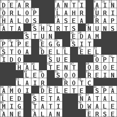 ACROSS 1. Letter starter 5. Opposed to 9. The 18th letter of the Arabic alphabet 12. Fourth or lowest deck 14. Cowardly lion portrayer 15. RI univ. 16. Rings 17. Toward the sea 18. Reproach for some lapse or misdeed 19. "One Day ___ Time" 20. Upper-body garments 23. Religious women 24. Make senseless or dizzy 25. Dutch treat 27. Corncob 30. Ovum 32. Be seated 33. Portico 34. Small valley 36. Snakelike fish 38. Wedding promise 39. Take to court 40. Choose 43. Actor Linden 46. Portable shelter 48. Mitch Miller's instrument 49. Lion 51. "Barney Miller" actor Jack 52. It's straight from the horse's mouth 53. Den 54. College mil. group 56. Mine, in Marseilles 58. Keyboard key 61. Health resort 64. Directed 65. Bristle 66. Relating to or accompanying birth 68. Russian fighter aircraft 69. Jacques of French films 70. A sleeping potion; an opiate (poet.) 71. One (Scot) 72. ____ Jay Lerner 73. Celtic language DOWN 1. Capital of the state of Qatar 2. Part of Q.E.F. 3. Silent film actress Nazimova 4. Friend of Pooh 5. Having or resembling wings 6. Political cartoonist Thomas 7. College papers 8. Retirement account (abbr.) 9. Gold (Symbol: Au) 10. SW Asia republic 11. Cuts off 13. Inconspicuous attention getter 21. Took on color 22. Eat 23. Nathan's nickname 24. Ocean 26. Pass on 27. Air pressure measure (abbr.) 28. It would 29. "Silly old bear" 31. Adhesives 35. Poe poem 37. Ear part 41. Luau course 42. "___ Little Indians" 44. Mountain range southwest of Kyrgyzstan 45. Luau accessory 47. A blast of a horn 48. The grampus (Milton) 50. Severe or trying experience 53. Cabin 55. Watch over 56. _ mater 57. Chow _ 59. Singer James 60. (Had) reclined 61. Play the lead 62. Friends 63. Toward shelter 65. R.R. building 67. Deep reverence