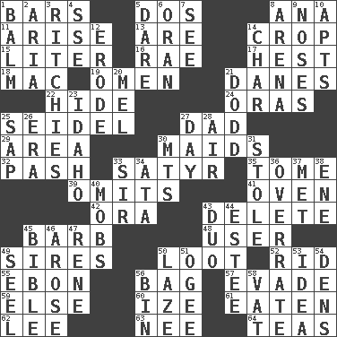 ACROSS 1. Soap units 5. Two (Sp.) 8. Santa ___, CA 11. Get up 13. "We ___ not amused" (Victoria) 14. Riding implement 15. 61 cubic inches 16. Actress Charlotte 17. Command 18. Apple computer (short form) 19. Sign of things to come 21. Natives or inhabitants of Denmark 22. Flintstone garb 24. Mouths or openings 25. A glass for beer 27. Male parent 29. Type of rug 30. Women servants 32. Romantic infatuation 33. Letch 35. Heavy book 39. Leaves out 41. Baking chamber 42. Mouth or opening 43. Erase 45. Sharp remark 48. One who uses or employs something 49. Male parents of animals 50. Spoils 52. To free from 55. Inky black, to poets 56. Container for groceries 57. Dodge 59. Otherwise 60. Ending with capital 61. Ingested 62. Area sheltered from the wind 63. Born 64. Afternoon social gatherings DOWN 1. Lip ointment 2. Operatic vocal solo 3. Actors Guy, Robert Welles, and Clint 4. Compass dir. 5. Have the gumption 6. NW Algerian seaport 7. Observe 8. Sports stadium 9. Olfactory organs 10. Flats, for short 12. Wear away 14. Burn to charcoal 20. Cartoonist voice _ Blanc 21. Texas town _ City 23. Potato state 25. Plant excrement 26. Epoch 27. 24 hours 28. Atmosphere 30. Mountains (abbr.) 31. Fur scarf 33. Title for a knight 34. "One Day ___ Time" 36. Make much ado about nothing 37. Was introduced to 38. Compass dir. 40. Crowds into 43. Superhero pair 44. First name in cosmetics 45. The Good Book 46. Came up 47. French philosopher Descartes 49. Stitch closed the eyes of (a falcon) 50. Goldbrick 51. Double curve, resembling the letter S 53. The main thing one is thinking about 54. Lairs 56. Storage container 58. Large container