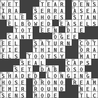 ACROSS 1. Dripping 4. Rend 8. Lairs 12. Lyricist Gershwin 13. Father Junipero _ 14. Toward the sea 15. The longest river in the world 17. Imelda's hoard 18. Comedian Laurel of Laurel & Hardy 19. Turned at an angle; bent 21. Artist's stands 23. Small child 24. Car or cant ending 26. Expire 27. Patter 28. Double curve, resembling the letter S 30. Snakelike fish 31. Titan orbits this 34. Small bed 37. Compete 38. One or ones belonging to thee 39. Mouth or opening 40. Raised railways 41. Tootsie (variant) 42. Floor covering 43. Lick closed 44. Balmoral and tarboosh 46. Arrange properly for use 47. Pat or tap gently 50. Bear (Spanish) 51. Cast a shadow over 54. Yearning 57. Flexible conduit 58. U. of Maine site 60. 480, 500 or 516 sheets of paper 62. Arab leader 63. Unit of ammunition 64. Teachers' org. 65. Elected reps. 66. Method 67. Affectionate concern, for short DOWN 1. Acquire through effort 2. One of the Great Lakes 3. Baron Munchausen's specialties 4. Giggle 5. Eat (away) 6. "We ___ not amused" (Victoria) 7. Raze (variant) 8. Small ungulate mammals of Africa 9. First name in cosmetics 10. Actress Patricia 11. Without 13. Compass dir. 16. Inky black, to poets 20. Baseball player Mel 22. Arabian gulf 25. Parts of speech 27. To provide with a ceiling 29. Jennifer or Joel 30. Night before a holiday 31. Portico 32. Hold, grip (Informal) 33. Teat (slang) 34. Piece 35. Mouths or openings 36. Make lace 41. Wig 43. Spring feasts 44. Gear tooth 45. SW Saudi Arabia district 46. Indian antelope 48. Verbally 49. Maid-servant 51. "______ My Girl" (Turtles hit) 52. Residence 53. Dormintory (informal) 55. Lower and raise head in agreement 56. Highlander 59. Friend of Pooh 61. Big _