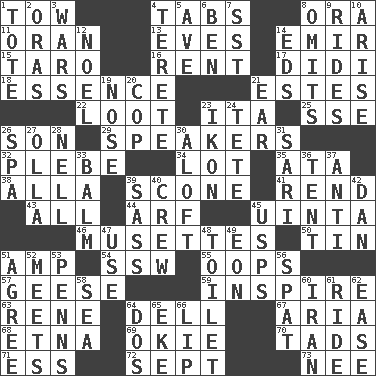 ACROSS 1. Pull behind 4. Bar bills 8. Mouth or opening 11. NW Algerian seaport 13. Nights before holidays 14. Arab leader 15. Edible starchy tuberous root 16. Monthly bill 17. "You Light Up My Life" star Conn 18. Substance 21. _____ Park, CO 22. Spoils 23. Call ___ day 25. Compass dir. 26. Male offspring 29. Orators 32. Military trainee 34. Car dealer's back yard 35. _ moment's notice (2 wds.) 38. Silent film actress Nazimova 39. Biscuitlike quick bread 41. Tear apart 43. Everything 44. Sandy's bark 45. National forest in Provo, Utah 46. French bagpipes 50. Shallow baking pan 51. Electrical Unit 54. Compass dir. 55. I made a mistake 57. Honkers 59. Heighten or intensify 63. French philosopher Descartes 64. Small valley 67. Operatic vocal solo 68. Inactive volcano in Sicily 69. Migrant worker of the '30s 70. Bits 71. Curvy letter 72. Back-to-school mo. 73. Born DOWN 1. Lug 2. Mouths or openings 3. Armed conflicts 4. Cylindrical with tapered ends 5. "___ Maria" 6. Benjamin's nick name 7. Fast jet (abbr.) 8. Leaves out 9. Amusement-park features 10. Ascend 12. Christmas carol 14. Begley and Asner 19. Characteristic smell of wine 20. Police officer (slang) 21. Ewer handle 23. Image 24. Wig 26. Health resort 27. Rounded earthenware pot or jar 28. 1994 drama film starring Jodie Foster 30. Upward 31. Indian skirt 33. Lip ointment 36. Portable shelter 37. Against 39. Backtalk 40. Group working together 42. Daniel's nick name 45. United States Postal Service (abbr.) 47. Purpose 48. Bathroom 49. A really long time 51. Match 52. Confronts 53. Actor Sean's family 56. Petty quarrel 58. Ocean 60. SW Asia republic 61. Travel on or in a vehicle 62. Relaxation 64. Two (Sp.) 65. Make supply last 66. Mouth edge