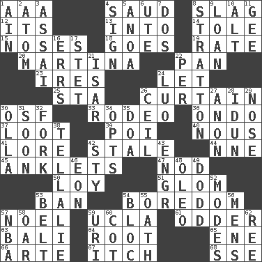 ACROSS 1. American Automobile Association (abbr.) 4. Saudi Arabian king (1953-1964) 8. Volcanic refuse 12. ___ a Wonderful Life 13. To the inside or interior of 14. Lacquered or enameled metalware 15. Olfactory organs 18. Travels 19. Assign a rank or rating to 20. Chrissie's court nemesis 22. Baking dish 23. Angers 24. Allow 25. R.R. building 26. Window treatment 30. Order of Saint Francis (abbr.) 33. Cowboy competition 36. Southwest Nigerian state 37. Spoils 39. Luau course 40. Common sense 41. Old wives' tales, e.g. 42. Lacking originality or spontaneity 44. Compass dir. 45. Short socks 47. Lower and raise head in agreement 50. Myrna of the movies 51. Seize upon or latch onto something 53. Forbid 54. Mood resulting from idleness 57. Christmas carol 59. Southern CA. univ. 61. More peculiar 63. Indonesian resort city 64. Carrot, for example 65. Compass dir. 66. Johnson of "Laugh-In" 67. Hankering 68. Compass dir. DOWN 1. The 18th letter of the Arabic alphabet 2. Smallest unit of an element 3. Slender Brazilian palm 4. Attach a signature 5. Small Philippine buffalo 6. Shoshoni 7. Two (Sp.) 8. Ski resort town in Vermont 9. Grant temporary use of 10. The first octave above the treble staff 11. Unit of force equal to gravity 16. Blunders 17. Proofreading order 21. Austrian river, tributary to the Danube 22. For each 24. Nilotic language 26. To provide with a ceiling 27. Soon (poet.) 28. Goddess of spring and wife of Bragi 29. Sense of smell 30. Water jar 31. Within a short period 32. Tined utensil 34. Chooses 35. ___ good deed 38. Copy Pinocchio 42. Filthy place 43. Engineer (abbr.) 46. A really long time 48. Butter sub 49. Texas town _ City 52. Methods 53. Waist strap 54. Coalition 55. Pledge 56. Not women's 57. Basketball assoc. 58. Boat paddle 59. RI univ. 60. Small bed 62. To separate or throw off