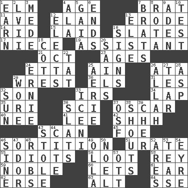ACROSS 1. Shade tree 4. Grow older 7. Naughty child 11. "___ Maria" 12. Enthusiasm 13. Eat (away) 14. To free from 15. Put down 16. Chalkboards 17. Sibling's daughter 19. Aide 21. Sep. follower 23. Grows older 24. Singer James 25. The 18th letter of the Arabic alphabet 26. _ moment's notice (2 wds.) 29. Take or capture by force 30. Raised railways 31. French article 32. Male offspring 33. Big collection agency 34. Infant locale 35. RI univ. 36. _-fi 37. Motion picture award 40. Born 41. Area sheltered from the wind 42. Quiet! 43. Glance over 45. Enemy 46. Making a chance decision by using lots 51. A salt of uric acid 55. Foolish or stupid persons 56. Plunder 58. Marina Del _, California 59. Having high moral qualities 60. Allows 61. Ewer handle 62. Celtic language 63. The first octave above the treble staff 64. Compass dir. DOWN 1. Merit 2. 57 in ancient Rome 3. Ancient Persian 4. According to 5. Greek goddess of the earth (variant) 6. Extremities 7. Naughty children 8. Round or rotation of duties 9. An important port of Yemen 10. Trial 12. Chooses 13. Otherwise 16. Public displays of written messages 18. ____ d'Azur (French Riviera) 20. Travel by water 22. Make lace 24. Bert's buddy 25. Nest on high 26. Assad's deity 27. Pull into pieces 28. Cleo's killer 29. Had on 32. Player for Phoenix 33. Ancient Celtic tribe of eastern Britain 36. Narrow boards 37. Order of Saint Francis (abbr.) 38. Yells 39. "Mermaids" star 43. Fur scarf 44. Quote 46. Trig term 47. Scent 48. Teases 49. Spanish pot 50. Christmas carol 52. Ancient Greek god of war 53. Afternoon social gatherings 54. Jane of fiction 57. Baseball player Mel