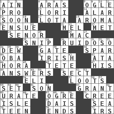 ACROSS 1. The 18th letter of the Arabic alphabet 4. Caspian sea tributary 8. Stare at amorously 12. Adept person 13. Australian parrot (variant) 14. Having or resembling wings 15. Within a short period 17. Globular water bottle used in Asia 18. Scent 19. Take place subsequently 21. Cartoonist voice _ Blanc 23. Was introduced to 24. Sir (Sp.) 26. Big _ 28. Sever or remove by pinching or nipping 30. Boisterous (Brazilian Portuguese) 34. Morning condensation 37. Yard entry 39. Coast Guard woman 40. Chief or king in Benin or Nigeria 41. From or relating to Ireland 43. "One Day ___ Time" 44. Israeli folk dance 46. Wig 47. Part of HMS, perhaps 48. Replies 51. Religious group 54. Biblical high priest 55. Plunders 58. Arrange properly for use 61. Boy, to dad 63. Monetary aid 65. A salt of uric acid 67. Legendary monster 71. Algonquian 72. Small island 73. Raised platform 74. Ocean 75. Adolescent 76. Conclusions 77. Big collection agency DOWN 1. Domed church section 2. Metal shackles 3. Trap for birds or small mammals 4. Everything 5. Friend of Pooh 6. Nonscientific branch of learning 7. Thailand, formerly 8. Boat paddle 9. Seize upon or latch onto something 10. Unable to walk 11. Part of Q.E.F. 16. Religious women 18. Jai _ 20. Age 22. Australian flightless bird 25. Swiss mountan, "Queen of the Mountains" 27. Music discs 29. Components 30. Musical pauses 31. Brightly colored fish 32. Suttee (variant) 33. Mouths or openings 34. Capital of the state of Qatar 35. Inky black, to poets 36. Armed conflicts 38. Standoff 42. Person who is morally reprehensible 45. Deep reverence 49. Otherwise 50. River (Sp.) 52. Gear tooth 53. Torque (variant) 56. Tarsus (plural) 57. Contemptuous expression 58. Set or collection 59. Celtic language 60. Lie 62. Connecting point 64. Afternoon social gatherings 66. Nine, plus one 68. Separate the seeds from cotton 69. To free from 70. Double-curved letter