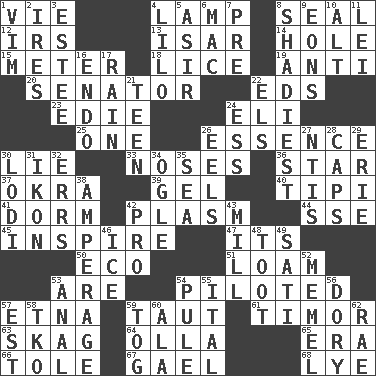 ACROSS 1. Compete 4. Desk light 8. Lick closed 12. Big collection agency 13. Austrian river, tributary to the Danube 14. Hollow 15. Distance measurement 18. Louse (plural) 19. Against 20. Legislator 22. Begley and Asner 23. Singer Brickell 24. Biblical high priest 25. Single 26. Core 30. Falsehood 33. Olfactory organs 36. Play the lead 37. Gumbo ingredient 39. Set 40. Native american tent (variation) 41. Dormintory (informal) 42. Suffix with ecto or cyto 44. Compass dir. 45. Stimulate to action 47. It is 50. Environmental prefix 51. Rich soil 53. "We ___ not amused" (Victoria) 54. Manned the helm 57. Inactive volcano in Sicily 59. Strained 61. Southeast Indonesia island 63. Heroin 64. Spanish pot 65. Epoch 66. Lacquered or enameled metalware 67. Highlander 68. Potassium hydroxide DOWN 1. Zeal 2. Angers 3. First name in cosmetics 4. _ and Stitch 5. SW Saudi Arabia district 6. Big _ 7. Before (prefix) 8. Most dubious of character or honesty 9. Immeasurably long periods of time 10. Keyboard modifier key 11. Luau accessory 16. Inside; within (prefix) 17. Water falling in drops from the sky 21. Adolescent 22. Raised railways 24. Curvy letter 26. Snakelike fish 27. Nuclear Threat Initiatives 28. Smile enhancers 29. One of the Great Lakes 30. Farming town in central California 31. Picture 32. Blunders 34. Stare at amorously 35. Ocean 38. Electrical Measurement 42. Adept person 43. Place where flour is made 46. Frozen water 48. A blast of a horn 49. Suttee (variant) 52. Klaipeda city 53. Of or related to the anus 54. Whine 55. Slanted text style (abbr.) 56. Rowboat 57. Eastern Standard Time (abbr.) 58. Ring climax 59. Coat; cloak 60. According to 62. Actress Charlotte