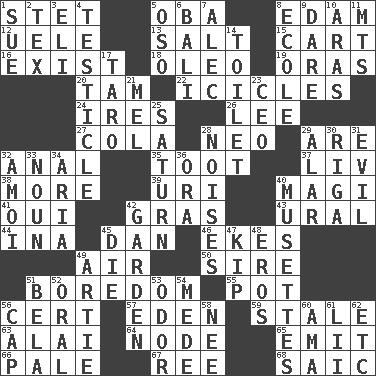 ACROSS 1. Proofreading order 5. Chief or king in Benin or Nigeria 8. Dutch treat 12. Ubangi River tributary 13. Table seasoning 15. Heavy open wagon 16. Be extant 18. Margarine 19. Mouths or openings 20. Scottish cap 22. Winter's stalactites 24. Angers 26. Area sheltered from the wind 27. Root beer relative 28. Modern: prefix 29. "We ___ not amused" (Victoria) 32. Of or related to the anus 35. A blast of a horn 37. 54 in ancient Rome 38. Greater amount 39. RI univ. 40. Wise men 41. Fr. "Yes" 42. Pate de foie ____ 43. Mountain range 44. _ tizzy (2 wds.) 45. One of the 12 tribes of Israel 46. Supplements with great effort 49. Atmosphere 50. Male parent of an animal 51. Mood resulting from idleness 55. Cooking vessel 56. An absolute certainty 57. Paradise 59. Having lost freshness 63. Jai _ 64. Connecting point 65. Give off 66. Light colored 67. Portuguese money of account (variant) 68. Ketch in the Levant DOWN 1. Take to court 2. John Ritter's dad 3. Connecticut Ivy Leaguer 4. One of the two male reproductive glands 5. Bear (Spanish) 6. Indonesian resort city 7. Actor Baldwin 8. Learning spot: Fr. 9. Have the gumption 10. Ancient river in northeast Turkey 11. Mountains (abbr.) 14. Bathroom 17. Edible starchy tuberous root 21. Cartoonist voice _ Blanc 23. Corporate head (abbr.) 25. Titan orbits this 28. Annoying sounds 29. Having or resembling wings 30. Capital of Latvia 31. Tending to cause great harm 32. Mine, in Marseilles 33. Part of speech 34. Roberta Peters solo 36. Mouth or opening 40. French bagpipes 42. Place where plants grow 45. Expire 47. Monetary unit of Laos 48. Greek god of love 49. Nick name for Arthur 51. Actor Lugosi 52. Taken by mouth 53. Aroma 54. Ancient Persian 56. Head covering 58. Born 60. Wet nurse (var.) 61. Cards in a Roman deck? 62. And so on (abbr.)