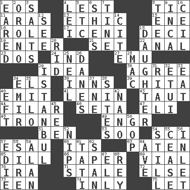 ACROSS 1. Greek goddess of the dawn 4. For fear that 8. Nervous spasm 11. Caspian sea tributary 13. Moral principle 15. Compass dir. 16. Hero or heavy, e.g. 17. Ancient Celtic tribe of eastern Britain 18. Tenth: prefix 19. Keyboard key 21. Arrange properly for use 22. Of or related to the anus 23. Two (Sp.) 24. Indiana (abbr.) 27. Australian flightless bird 29. It may be bright or harebrained 30. Match 34. Raised railways 36. Taverns 39. Riviera of "Kiss of the Spider Woman" 40. Give off 41. Soviet premier 1918-24 43. Tense 44. Having threads 46. Stalk of a moss capsule 47. Connecticut Ivy Leaguer 48. Heavy duty weighing machine 49. Engineer (abbr.) 51. Benjamin's nick name 53. "Barney Miller" actor Jack 54. _-fi 57. Son of Isaac 60. ___ a Wonderful Life 63. Eucharist need 65. Deli pickle 66. Some stationery 69. Small bottle 70. Retirement account (abbr.) 71. Having lost freshness 72. Otherwise 73. Car or cant ending 74. Inwardly 75. Allow DOWN 1. Having ears or earlike features 2. U. of Maine site 3. Table seasonings 4. Luau accessory 5. And so on (abbr.) 6. "______ My Girl" (Turtles hit) 7. Prong on a fork 8. Adolescent 9. South American Indian 10. To provide with a ceiling 12. Perceive with the eye 14. Quote 18. Female child 20. To free from 25. Famous astronaut Armstrong 26. Natives or inhabitants of Denmark 28. Apple computer (short form) 29. Byzantium, centuries later 31. Monetary unit of Yemen 32. Needle case 33. Ingest 34. Independent ruler or chieftain 35. _ and Stitch 37. Compass dir. 38. Locates 40. Newt 42. Billionth: prefix 45. To separate or throw off 50. Grand Old Party 52. Cuts off 54. Free from disturbance or agitation 55. Desist 56. An arm off of a larger body of water 57. Singer Brickell 58. Beget 59. Actor Alda or Thicke 61. Jacques of French films 62. Connect, as a bridge 64. "___ Maria" 67. Pipe bend 68. Marina Del _, California