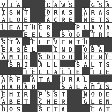 ACROSS 1. By way of 4. Crow sounds 8. Girls' org. (abbr.) 11. Is not 13. Mouths or openings 14. Caspian sea tributary 15. Medicinal plant 16. 43,560 square feet 17. Moistens 18. Cordwainer's material 21. Beach, in Buenos Aires 22. Snakelike fish 23. "Barney Miller" actor Jack 25. Three (prefix) 26. R.R. building 29. Veterans Day date 32. Artist's stand 34. Indiana (abbr.) 35. Chief or king in Benin or Nigeria 38. Among 39. Twentieth part of a lira 41. French philosopher Descartes 43. _ Lanka 44. 100% 45. Table seasonings 46. Copy Pinocchio 50. Standoff 51. Sandy's bark 54. _ moment's notice (2 wds.) 55. Mountain range 57. Ethiopian city, capital of Harari 59. Deli grouping 63. Independent ruler or chieftain 64. Inconspicuous attention getter 67. Thickened enlargement 68. Collude with 69. "Mermaids" star 70. Small, secluded valley 71. Two (Sp.) 72. Stalk of a moss capsule 73. Consume DOWN 1. Small bottle 2. Capri or Wight 3. Small Philippine buffalo 4. Rough 5. Curve 6. Armed conflict 7. Compass dir. 8. Relatively large 9. Man with strong sexual desires 10. Slender Brazilian palm 12. Wig 14. Leather borer 19. Person who is morally reprehensible 20. Pipe bend 21. Plant holder 23. Transmit 24. Southwest Nigerian state 26. Ocean 27. Scottish caps 28. SW Saudi Arabia district 30. Country residence 31. Israeli folk dance 33. Prepare for publication 36. Waist strap 37. Against 39. Table seasoning 40. Rounded earthenware pot or jar 42. Compass dir. 45. Lick closed 47. Hearing organ 48. A period of five years 49. Retirement account (abbr.) 51. Toward the future 52. Role for Stallone 53. Strips of potato fried in deep fat 56. Austrian-born American filmmaker Fritz 58. Tate display 60. Undercover agent 61. The main thing one is thinking about 62. Posted 64. Personal Computers (abbr.) 65. A female animal or person 66. Arrange properly for use