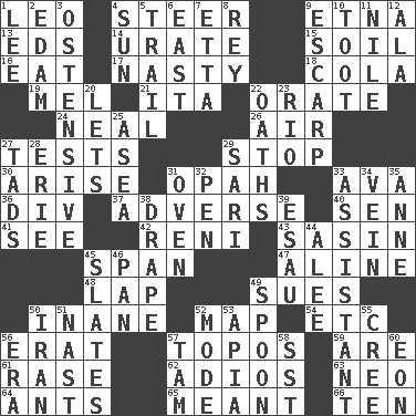 ACROSS 1. Lion 4. Bull 9. Inactive volcano in Sicily 13. Begley and Asner 14. A salt of uric acid 15. The visible part of the earth's surface 16. Consume 17. Smutty 18. Root beer relative 19. Cartoonist voice _ Blanc 21. Call ___ day 22. Speak pompously 24. Actress Patricia 26. Wind 27. Trials 29. Constrict 30. Ascend 31. Brightly colored fish 33. Actress Gardner 36. HTML Container Element 37. Contrary to your interests or welfare 40. Elected rep. 41. Perceive with the eye 42. Painter Guido (1575-1642) 43. Indian antelope 45. Connect, as a bridge 47. Place in a line 48. Infant locale 49. Institutes legal proceedings 50. Silly 52. Atlas unit 54. And so on (abbr.) 56. Part of Q.E.F. 57. Traditional theme or motif 59. "We ___ not amused" (Victoria) 61. Raze (variant) 62. Goodbye (Sp.) 63. Modern: prefix 64. Pismires 65. Intended 66. Nine, plus one DOWN 1. Area sheltered from the wind 2. Dutch treat 3. Clearly or manifestly demonstrative 4. Player for Phoenix 5. Drop behind 6. 90 degrees 7. Singer James 8. Marina Del _, California 9. Fortification 10. A blast of a horn 11. Mediterranean tributary 12. According to 20. Allows 22. Profane or obscene expressions 23. _ de Janeiro 25. At sea 27. Small amounts or degrees 28. 4th largest of the Great Lakes 29. Indian skirt 31. Baking chamber 32. Fenced enclosure 33. Aide 34. Distinctive style or manner 35. Queen of England 1702-14 38. Window treatment 39. Son of Isaac 44. Toward shelter 45. Chalkboards 46. Baking dish 49. Soup utensil 50. SW Asia republic 51. Political cartoonist Thomas 52. Method 53. Capital of Western Samoa 55. Algonquian 56. Period 57. Scottish cap 58. Fast jet (abbr.) 60. Age