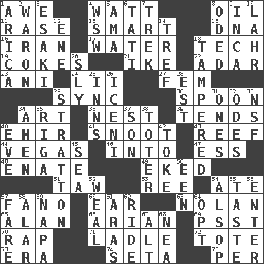 ACROSS 1. Deep reverence 4. Electrical Unit 8. Lubricate 11. Raze (variant) 13. Don Adams' spy role 15. Heredity factor (abbr.) 16. SW Asia republic 17. Wetness 18. Technical 19. Popular sodas 21. Eisenhower's nickname 22. The sixth month of the Jewish calendar 23. Cuckoo 24. Cards in a Roman deck? 27. Opposite of masc. 29. Synchronize (abbr.) 30. Soup utensil 34. Nonscientific branch of learning 36. Egg locale 39. Looks after 40. Independent ruler or chieftain 41. Snob 43. Coral collection 44. Viva Las _ 46. To the inside or interior of 47. Curvy letter 48. Maternal 49. Supplemented with great effort 51. The 23rd letter of the Hebrew alphabet 53. To riddle 54. Had dinner 57. Papal veil 60. Ewer handle 63. Pitcher Ryan 65. Actor Alda or Thicke 66. Believer in; advocate of (suffix) 69. Inconspicuous attention getter 70. Reproach for some lapse or misdeed 71. Dipping utensil 72. Haul 73. Period 74. Bristle 75. For each DOWN 1. N. Chile seaport 2. Make _____ (do battle with) 3. 1973 Nobel Price Winner (Physics) Leo 4. Compass dir. 5. Wet nurse (var.) 6. Jacques of French films 7. Long journey 8. Wrote a lyric poem 9. South American Indian 10. Cowardly lion portrayer 12. Compass dir. 14. Unclean, religiously 18. ________ with (broke a safety seal) 20. Playfully artful 25. Restaurants 26. Ancient Celtic tribe of eastern Britain 28. Eastern Standard Time (abbr.) 29. Ski resort town in Vermont 31. Washington bills 32. Lyric poems 33. Science/research agcy. 34. So be it 35. Port city in Latvia 37. Manchild 38. Carrier 40. Night before a holiday 42. Puff or smoke 45. Ocean 50. Car or cant ending 52. Welt 54. Columnist Joseph or Stewart 55. Clothes sense 56. Keyboard key 57. Conductor's collection 58. Having or resembling wings 59. California wine valley 61. Ancient river in northeast Turkey 62. Travel on an animal 64. Elect 67. Keyboard modifier key 68. Teachers' org.