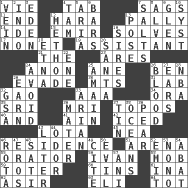 ACROSS 1. Compete 4. Keyboard key 7. Settles 11. Conclude 12. Hindu Mythology: god of death 13. Friendly 14. Binary compound 15. Independent ruler or chieftain 16. Finds the solution 17. Music written for nine 19. Helper 21. Definite Article 23. Ancient Greek god of war 24. Soon (poet.) 25. A saturated hydrocarbon 26. Benjamin's nick name 29. Elude 30. Mountains (abbr.) 31. Experiment locale 32. E Mali city 33. American Automobile Association (abbr.) 34. Mouth or opening 35. _ Lanka 36. Medical imaging device (abbr.) 37. Traditional theme or motif 40. Added to 41. The 18th letter of the Arabic alphabet 42. On the rocks 43. Globular water bottle used in Asia 45. Teachers' org. 46. Dwelling 51. Sports stadium 55. Speaker 56. "Terrible" tsar 58. Crowd into 59. Carrier 60. Canisters 61. _ tizzy (2 wds.) 62. SW Saudi Arabia district 63. Biblical high priest 64. Small child DOWN 1. Distinctive style or manner 2. _ china 3. Genesis locale 4. Scottish cap 5. Operatic vocal solo 6. Long, evenly shaped pieces 7. Table seasonings 8. Inventor's middle name 9. Small, secluded valley 10. System (abbr.) 12. Mode 13. Airs 16. Fathers 18. Inactive volcano in Sicily 20. Before Barbara or Clara 22. Compass dir. 24. Shun 25. With great haste 26. Vital fluid 27. Hearing organs 28. Basketball assoc. 29. Merit 32. Girls' org. (abbr.) 33. Believer in; advocate of (suffix) 36. Mother 37. Metal container 38. Seas 39. Lightbulb-shaped fruit 43. 61 cubic inches 44. Aroma 46. Round or rotation of duties 47. Greek god of love 48. Suttee (variant) 49. Quote 50. Tending to cause great harm 52. Send forth 53. Words to Nanette 54. Blind as ____ 57. Black tropical American cuckoo