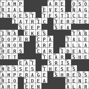 ACROSS 1. Pack (down) 5. "We ___ not amused" (Victoria) 8. Bear (Spanish) 11. Monetary unit of Yemen 12. Nights before holidays 13. Tired old horse 14. Swallow 17. A testis 19. Of or pertaining to medicine 21. Cylindrical with tapered ends 22. Ooze 23. Ocean 24. _ tizzy (2 wds.) 27. Makes supply last 29. Keyboard key 32. Drug addict 34. Tax preparer (abbr.) 36. Lie 37. Soon (poet.) 38. Sandy's bark 39. Silent film actress Nazimova 40. Possessive pronoun 41. 4-wheeled motor vehicle 42. Standard of perfection 43. Baseball player Mel 44. Rend 46. A female animal or person 47. Erode 50. Indian titles of respect 52. Makes clutter 55. College papers 57. Electrical Measurement 59. Fragments 62. River (Sp.) 63. It may be bright or harebrained 64. Painter Guido (1575-1642) 65. Tate display 66. Car or cant ending 67. Having or resembling wings DOWN 1. Three (prefix) 2. The 18th letter of the Arabic alphabet 3. Wise men 4. Entreaties 5. "___ Maria" 6. Musical pauses 7. First name in cosmetics 8. Single time 9. Table seasoning 10. Double curve, resembling the letter S 12. And so on (abbr.) 15. Navigate 16. Long journey 18. Lyricist Gershwin 20. Medicinal drug used to evoke vomiting 24. Potato state 25. Music written for nine 26. To the left, to Queeg 28. Small fatty European fish 29. Falsehoods 30. Assad's deity 31. Calif. Air Force Base 33. Followers of ems 35. Anew 36. Small amount or degree 42. From or relating to Ireland 45. Ancient Greek god of war 47. Compass dir. 48. Nest on high 49. Sadhe (variant) 51. Spanish missionary in California 52. Hindu Mythology: god of death 53. Independent ruler or chieftain 54. Blemish 55. Beverage made from leaves 56. Sew up the eyelids of hawks and falcons 58. Commissioned mil. rank 60. Heredity factor (abbr.) 61. Title for a knight