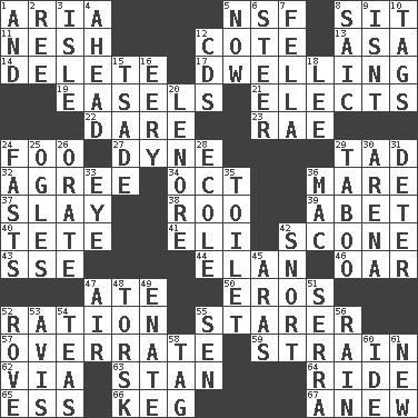 ACROSS 1. Operatic vocal solo 5. Overdraft (abbr.) 8. Be seated 11. Tender 12. ____ d'Azur (French Riviera) 13. White ___ sheet 14. Keyboard key 17. Residence 19. Artist's stands 21. Opts 22. Have the gumption 23. Actress Charlotte 24. Egg _ yung 27. Centimeter-gram-second unit of force 29. Bit 32. Match 34. Sep. follower 36. Female horse 37. Kill 38. Friend of Pooh 39. Collude with 40. Wig 41. Connecticut Ivy Leaguer 42. Biscuitlike quick bread 43. Compass dir. 44. Style 46. Boat paddle 47. Had dinner 50. Greek god of love 52. Food allowance for one day 55. A viewer who gazes fixedly 57. Make much ado about nothing 59. Put through a sieve 62. By way of 63. Comedian Laurel of Laurel & Hardy 64. Travel on an animal 65. Double-curved letter 66. Cask 67. Afresh DOWN 1. Added to 2. To separate or throw off 3. Capri or Wight 4. Having the leading position 5. At this time 6. Bull 7. Man or boy (slang) 8. Ketch in the Levant 9. Is not 10. Labels 12. Music discs 15. Sadhe (variant) 16. Suggestive of the supernatural 18. Area sheltered from the wind 20. Poe poem 24. Goes without food and/or water 25. Stares 26. Speak pompously 28. Learning spot: Fr. 29. Off limits 30. Sports stadium 31. Prevent from occurring 33. Sight organ 35. Bathroom 36. Apple computer (short form) 42. Derisive sound 45. Ancient river in northeast Turkey 47. Atmosphere 48. Cod relative 49. Maternal 51. Spanish missionary in California 52. Be footloose 53. Deliberation 54. Beverages made from leaves 55. Elected rep. 56. Precipitation 58. Label 60. Binary compound 61. ___ Haven, CT