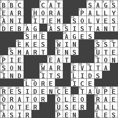 ACROSS 1. English channel? 4. Feline 7. Droops 11. Hearing organ 12. Israeli folk dance 13. Friendly 14. Cuckoo 15. A distinct part 16. Finds the solution 17. Debunk (Brit. slang) 19. Helper 21. A female animal or person 23. Ripens 24. Makes supply last 25. Acquire through effort 26. Fast jet (abbr.) 29. Don Adams' spy role 30. Followers of ems 31. Shoshoni 32. Sliced dessert 33. Erode 34. Electrically charged atom 35. Manchild 36. Armed conflict 37. Webber/Rice musical 40. Indiana (abbr.) 41. It is 42. Flaplike coverings 43. Old wives' tales, e.g. 45. Frozen water 46. Dwelling 51. Grayish beige 55. Speaker 56. Butter sub 58. Actress Charlotte 59. Carrier 60. One who makes use of a thing 61. 100% 62. SW Saudi Arabia district 63. Fenced enclosure 64. French article DOWN 1. Necklace unit 2. Object of repulsion 3. Baby bed with high sides 4. Small bed 5. Type of rug 6. Scottish caps 7. Table seasonings 8. Inventor's middle name 9. Small, secluded valley 10. System (abbr.) 12. Having greater elevation 13. Airs 16. Public displays of written messages 18. "____ silly question..." 20. Virtuous person 22. Eastern Standard Time (abbr.) 24. Make improvements or corrections to 25. Puts on (as clothing) 26. Sets of matching outer garments 27. Portico 28. "___ Little Indians" 29. The Jewish people; Israel 32. Air pressure measure (abbr.) 33. Ingested 36. One who wires 37. Connecticut Ivy Leaguer 38. Winning man's name 39. It may be bright or harebrained 43. 61 cubic inches 44. Aroma 46. Roll call or roster of names 47. Greek god of love 48. Suttee (variant) 49. Clever action or accomplishment 50. Otherwise 52. Mountain range 53. Diluted with white 54. Snakelike fish 57. Car or cant ending