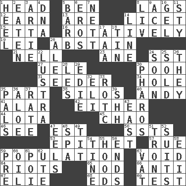ACROSS 1. Froth on beer 5. Benjamin's nick name 8. Falls behind 12. Merit 13. "We ___ not amused" (Victoria) 14. It is permitted: Lat. 15. Singer James 16. Rotating or pertaining to rotation 19. Flowery wreath 20. Choose not to consume 21. 1994 drama film starring Jodie Foster 23. One (Scot) 24. Fast jet (abbr.) 27. Ubangi River tributary 30. "Silly old bear" 31. Sowing specialist 34. Opening into or through something 35. Piece 38. Grain storage towers 40. "60 Minutes" Commentator Rooney 41. Having or resembling wings 42. One or the other 44. Globular water bottle used in Asia 45. US Secretary of Labor Elaine L. _ 46. Perceive with the eye 47. Eastern Standard Time (abbr.) 50. Fast planes 53. Curse 57. Sorrow 59. Census information 63. Null 64. Debaucheries 65. Dreamland 66. Against 67. Writer Wiesel 68. Begley and Asner 69. Trial DOWN 1. The bottom of a shoe or boot 2. Ingested 3. Nick name for Arthur 4. Heredity factor (abbr.) 5. Sharp remark 6. Greek god of love 7. Remaining after all deductions 8. 54 in ancient Rome 9. Adept person 10. Set 11. Filthy place 14. Actor's bit 17. American Automobile Association (abbr.) 18. Shallow baking pan 20. Toward shelter 22. A period of five years 24. Within a short period 25. Disposed of to a purchaser 26. Those things 28. French article 29. Singer Brickell 30. N Egypt peninsula 32. Biblical high priest 33. College mil. group 35. Friends 36. Medicinal plant 37. Assign a rank or rating to 39. Quiet! 43. 90 degrees 47. Snakelike fish 48. Health resort 49. Teat (slang) 51. Marketplace scale 52. Costumes for special activities 54. Prong on a fork 55. Parka part 56. Extremities 58. Prepare for publication 59. Before (prefix) 60. Lubricate 61. Luau course 62. Shoshoni 63. Large container