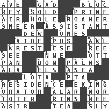 ACROSS 1. "___ Maria" 4. E Mali city 7. Alliance 11. Marina Del _, California 12. Exchanged or delivered for money 13. A-one 14. Atmosphere 15. Hollow 16. Wanderer 17. Scornful expression 19. Helper 21. Morning condensation 23. Singles 24. Helper 25. Purulenc 26. Leather borer 29. Obtain by seizing forcibly or violently 30. Compass dir. 31. To separate or throw off 32. Perceive with the eye 33. Compass dir. 34. Baseball player Mel 35. Baking dish 36. Spanish title 37. Insides of hands 40. In the manner of 41. Raised railways 42. Toward the sea 43. Globular water bottle used in Asia 45. Parent Teacher Association (abbr.) 46. Home 51. Supplementing with great effort 55. Speaker 56. Having or resembling wings 58. Not either 59. Carrier 60. Basketball hoops 61. Born 62. SW Saudi Arabia district 63. Beverage made from leaves 64. Secret DOWN 1. Ancient river in northeast Turkey 2. Distinctive style or manner 3. Jane of fiction 4. Thick or sticky substance 5. Silent film actress Nazimova 6. Lyric poems 7. Naughty children 8. Pale green bean 9. Presage 10. Foregone conclusion 12. Tears up 13. Introduce or present, as a question 16. Wash lightly 18. Singer Brickell 20. Lush 22. Soggy 24. Sports stadium 25. Actor Sean's family 26. Scent 27. Moistens 28. Allow 29. Welt 32. Health resort 33. Pitcher Ryan 36. Prevent from occurring 37. Infant food 38. Michaelmas daisies 39. Path through which fluid escapes 43. 61 cubic inches 44. Aroma 46. Roll call or roster of names 47. Greek god of love 48. Suttee (variant) 49. Haul 50. Writer Wiesel 52. Restaurants 53. Christmas carol 54. Jennifer or Joel 57. Nursemaid (var.)