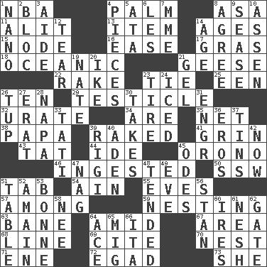 ACROSS 1. Basketball assoc. 4. Inside of hand 8. White ___ sheet 11. Came down and settled, as after flight 13. Detail 14. Eons 15. Connecting point 16. Comfort 17. Pate de foie ____ 18. Pertaining to the sea 21. Honkers 22. Libertine 23. Neckwear 25. Car or cant ending 26. "___ Little Indians" 29. A testis 32. A salt of uric acid 34. "We ___ not amused" (Victoria) 35. Fish or hair follower 38. Dad 39. Swept the length of 41. Amused look 43. Make lace 44. Binary compound 45. U. of Maine site 46. Eaten 50. Compass dir. 51. Bar bill 54. The 18th letter of the Arabic alphabet 55. Nights before holidays 57. Amid 59. Nestling 63. Object of repulsion 64. Among 67. Length times width 68. Actor's bit 69. Quote 70. A home for chicks 71. Compass dir. 72. Mild oath 73. A female animal or person DOWN 1. Billionth: prefix 2. Coalition 3. Helper 4. Components 5. _ moment's notice (2 wds.) 6. French article 7. Madame (abbr.) 8. Match 9. Gospel singer Marvin 10. NE Netherlands city 12. Pull apart 14. Ripen 19. Nathan's nickname 20. Mamie's husband 21. Set 23. Become fatigued 24. On the rocks 26. Uncastrated adult male sheep 27. Part of Q.E.F. 28. California wine valley 30. Proceeds 31. Engineer (abbr.) 33. Jacques of French films 36. Greek god of love 37. Airtight sealed metal containers 39. Swiss mountan, "Queen of the Mountains" 40. Arabian gulf 42. At this time 45. Lyric poems 47. Tired old horse 48. Watched over 49. First lady 51. Eating place 52. At full speed 53. Maid-servant 56. Comedian Laurel of Laurel & Hardy 58. Born 60. Angers 61. Tender 62. Yard entry 64. Adept person 65. Russian fighter aircraft 66. Call ___ day