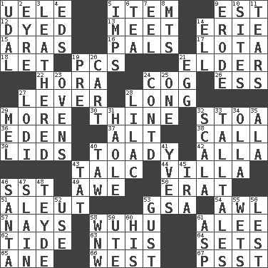 ACROSS 1. Ubangi River tributary 5. Detail 9. Eastern Standard Time (abbr.) 12. Colored 13. Rendezvous 14. 4th largest of the Great Lakes 15. Ancient river in northeast Turkey 16. Friends 17. Globular water bottle used in Asia 18. Allow 19. Personal Computers (abbr.) 21. A person who is older than you are 22. Israeli folk dance 24. Gear tooth 26. Curvy letter 27. Prying instrument 28. Having great length 29. Greater amount 30. One or ones belonging to thee 32. Portico 36. Locale of original sin 37. Keyboard modifier key 38. Give a ring to 39. Flaplike coverings 40. Sycophant 42. Silent film actress Nazimova 43. Baby powder 44. Country residence 46. Fast jet (abbr.) 49. Deep reverence 50. Part of Q.E.F. 51. Eskimo relative 53. Girls' org. (abbr.) 54. Leather borer 57. Negative votes 58. Chinese city south-southwest of Nanjing 61. Toward shelter 62. Periodic rise and fall of the sea level 63. Nuclear Threat Initiatives 64. Arranges properly for use 65. A saturated hydrocarbon 66. Compass direction 67. Inconspicuous attention getter DOWN 1. Allodial 2. Jane of fiction 3. Tough but pliablecoriaceous 4. Begley and Asner 5. Naughty children 6. Afternoon social gathering 7. Snakelike fish 8. Mountains (abbr.) 9. Eat (away) 10. Locates 11. Separates forcefully 14. Pipe bend 19. Before (prefix) 20. Draw slowly or heavily 21. Ovum 23. Baking chambers 24. Continued (abbr.) 25. Single 27. Farming town in central California 28. Pale purple color 29. Cartoonist voice _ Blanc 31. White Person, in Hawaii 32. Any of the three canals of the cochlea 33. Baron Munchausen's specialties 34. Spanish pot 35. Chicken ___ king 40. The 23rd letter of the Hebrew alphabet 41. Jacques Cousteau's middle name 43. Make lace 45. Retirement account (abbr.) 46. Before Barbara or Clara 47. Killed 48. Miss Universe 1986, Barbara Palacios _ 52. Purpose 53. Abrupt rush of wind 55. Moistens 56. For fear that 58. Compass dir. 59. Shoshoni 60. Part of HMS, perhaps 61. Viper