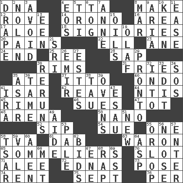ACROSS 1. Heredity factor (abbr.) 4. Singer James 8. Create 12. Be footloose 14. U. of Maine site 16. Length times width 17. Medicinal plant 18. Seigniories (variant) 20. Aches 22. Pipe bend 23. A saturated hydrocarbon 24. Conclude 25. To separate or throw off 28. Plant excrement 30. Basketball hoops 31. Strips of potato fried in deep fat 35. Had dinner 37. "Tell ____ the Marines!" 40. Southwest Nigerian state 41. Austrian river, tributary to the Danube 42. Break or tear apart 44. Nuclear Threat Initiatives 45. Tall New Zealand timber tree 46. Takes to court 47. Small child 48. Sports stadium 50. Billionth: prefix 52. Small drink 54. Institute legal proceedings 55. Single 58. Federal power corp. 61. Pat or tap gently 63. Make _____ (do battle with) 65. Wine waiters 70. Notch 71. Toward shelter 72. Ferber et al. 73. Introduce or present, as a question 74. Monthly bill 75. Back-to-school mo. 76. For each DOWN 1. Window treatment 2. Pitcher Ryan 3. Prevent the occurrence of 4. Greek goddess of the dawn 5. Three (prefix) 6. Coat; cloak 7. Singer Murray 8. Third mo. 9. Operatic vocal solo 10. Peachy ____! 11. Comfort 13. Car or cant ending 15. Petroleums 19. Norwegian king 21. _ Lanka 26. Independent ruler or chieftain 27. _____ Park, CO 29. Right away 30. Summer TV shows 32. To the inside or interior of 33. Prepare for publication 34. Distress signal 35. SW Saudi Arabia district 36. Not wild 38. The 19th letter of the Greek alphabet 39. Baking chambers 41. Retirement account (abbr.) 43. He sold his birthright 49. Assistant 51. ___ Haven, CT 53. Light colored 55. Fourth or lowest deck 56. Trap for birds or small mammals 57. Keyboard key 58. Russian ruler of old 59. Short-tailed, large-bodied rat 60. So be it 62. Auction offers 64. Viper 66. Was introduced to 67. Compass dir. 68. Hit sharply and swiftly 69. Fast jet (abbr.)