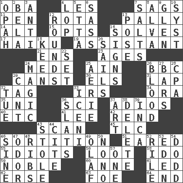 ACROSS 1. Chief or king in Benin or Nigeria 4. French article 7. Settles 11. Animal enclosure 12. Round or rotation of duties 13. Chummy 14. The first octave above the treble staff 15. Chooses 16. Finds the solution 17. Japanese poetic form 19. Helper 21. Followers of ems 23. Eons 24. Ancient Persian 25. The 18th letter of the Arabic alphabet 26. English channel? 29. 2nd pers. sing. pres. of can (arch.) 30. Raised railways 31. Infant locale 32. Label 33. Big collection agency 34. Mouth or opening 35. University (slang) 36. _-fi 37. Goodbye (Sp.) 40. And so on (abbr.) 41. Area sheltered from the wind 42. Tear apart 43. Skim 45. Affectionate concern, for short 46. Drawing lots 51. Having ears or earlike features 55. Foolish or stupid persons 56. Plunder 58. Wedding promise 59. Having high moral qualities 60. Singer Murray 61. Directed 62. Celtic language 63. Enemy 64. Conclude DOWN 1. Brightly colored fish 2. Actor Lugosi 3. Opposed to 4. Trim (branches) 5. Singer James 6. Backtalk 7. Table seasonings 8. Inventor's middle name 9. Small, secluded valley 10. System (abbr.) 12. Periods in a boxing match 13. Airs 16. Public displays of written messages 18. Peachy ____! 20. Moves on water 22. Put into a specified state 24. Mysterious quality of enchantment 25. Nest on high 26. Vital fluid 27. Soap units 28. Tax preparer (abbr.) 29. Patter 32. Third day of the wk. 33. Ancient Celtic tribe of eastern Britain 36. Narrow boards 37. Tate display 38. Keyboard key 39. South American Indian 43. Took without asking 44. Quote 46. Trig term 47. Scent 48. Chest bones 49. Norwegian king 50. Words to Nanette 52. Cause heat under the collar 53. Genesis locale 54. Texas town _ City 57. Single