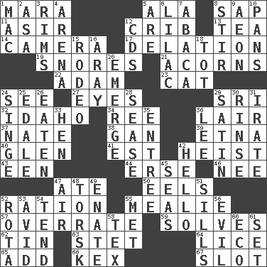 ACROSS 1. Hindu Mythology: god of death 5. Chicken ___ king 8. Plant excrement 11. SW Saudi Arabia district 12. Baby bed with high sides 13. Afternoon social gathering 14. Device for capturing images 17. Accusation by an informer 19. Sounds asleep 21. Oak nuts 22. First man 23. Feline 24. Observe 27. Snake ____ (dice throw) 29. _ Lanka 32. Potato state 34. To riddle 36. Den 37. Nathan's nickname 38. Separate the seeds from cotton 39. Inactive volcano in Sicily 40. Small, secluded valley 41. Eastern Standard Time (abbr.) 42. Robbery 43. Car or cant ending 44. Celtic language 46. Born 47. Had dinner 50. Snakelike fish 52. Food allowance for one day 55. Ear of corn 57. Make much ado about nothing 59. Finds the solution 62. Metal container 63. Proofreading order 64. Louse (plural) 65. Say or write further 66. A weed 67. Position in a hierarchy or organization DOWN 1. Apple computer (short form) 2. White ___ sheet 3. Basketball hoops 4. Sports stadium 5. "We ___ not amused" (Victoria) 6. Pale purple color 7. Phillipine bananalike plant 8. Disorderly outburst 9. Age 10. Zero-star reviews 12. Music discs 15. Cowboy competition 16. Like ___ of sunshine 18. Small child 20. Develop 24. Scorch 25. Peak District village in England 26. Ingested 28. Gospel singer Marvin 29. Smooth fabric 30. Remove soap 31. Feeling or showing extreme anger 33. Layer 35. Main course 36. Area sheltered from the wind 42. Phone greeting 45. Oceans 47. Atmosphere 48. Cod relative 49. Related on the mother's side 51. Beverly of Met fame 52. Roll call or roster of names 53. Enthusiastic 54. Be inclined (to) 55. Was introduced to 56. Tending to cause great harm 58. John Ritter's dad 60. Environmental prefix 61. Arrange properly for use
