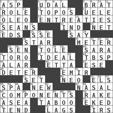ACROSS 1. Cleo's killer 4. Hereditary estate 8. Naughty child 12. Hero or heavy, e.g. 14. Traditional theme or motif 16. Ubangi River tributary 17. Margarine 18. Pleas 20. Actors Connery and Penn 22. Working for oneself (abbr.) 23. Fish or hair follower 24. Begley and Asner 25. Compass dir. 28. Declare 30. Play the lead 31. Distance measurement 35. Elected rep. 37. Lacquered or enameled metalware 40. "Two Mules for Sister ____" 41. "Corrida" creature 42. Standard of perfection 44. Cook's measure (abbr.) 45. Having or resembling wings 46. Singer James 47. Compass dir. 48. Prevent from occurring 50. Independent ruler or chieftain 52. Arrange properly for use 54. Modern: prefix 55. Raised railways 58. Health resort 61. ___ Haven, CT 63. Relating to the nose 65. Pieces 70. Libertine 71. Toward the sea 72. Off limits 73. Supplemented with great effort 74. Be inclined (to) 75. Straggles 76. Big collection agency DOWN 1. Came up 2. Having a sole or soles 3. Entreaties 4. Shoshoni 5. Spanish title 6. Fitting 7. Australian parrot (variant) 8. On the contrary 9. It's straight from the horse's mouth 10. Toward shelter 11. Trial 13. A really long time 15. Elected reps. 19. First of billions? 21. Fast jet (abbr.) 26. Suttee (variant) 27. Wear away 29. Last past 30. Sounds asleep 32. Bar bills 33. Celtic language 34. Hit sharply and swiftly 35. Not divided or shared with others 36. Part of Q.E.F. 38. Allow 39. Ingested 41. Small boy 43. Unable to walk 49. Western Nevada city 51. Electrically charged atom 53. Portable shelter 55. 1973 Nobel Price Winner (Physics) Leo 56. Member of a famous L.A. basketball team 57. Bobsleighs 58. Get outta here! 59. Introduce or present, as a question 60. So be it 62. Welt 64. "We ___ not amused" (Victoria) 66. Writing tablet 67. Basketball assoc. 68. Coat; cloak 69. Distress signal