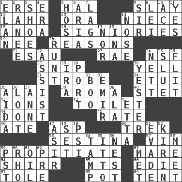 ACROSS 1. Celtic language 5. Actor Linden 8. Kill 12. Cowardly lion portrayer 13. Mouth or opening 14. Sibling's daughter 15. Small Philippine buffalo 16. Seigniories (variant) 19. Born 20. Thinks logically 21. He sold his birthright 23. Actress Charlotte 24. Overdraft (abbr.) 27. Sever or remove by pinching or nipping 30. Shout 31. Disco prop 34. Needle holder 35. Jai ____ 38. Odor 40. Proofreading order 41. Charged atoms 42. Bathroom plumbing fixture 44. Do not 45. Pace 46. Had dinner 47. Viper 50. Long journey 53. French poetic form 57. Zeal 59. Conciliate 63. Female horse 64. Bake eggs in their shells 65. Mountains (abbr.) 66. Singer Brickell 67. Lacquered or enameled metalware 68. Cooking vessel 69. Portable shelter DOWN 1. Liveliness 2. Indian princess (variant) 3. Imelda's hoard 4. Epoch 5. Flexible conduit 6. Operatic vocal solo 7. Fails to keep up a pace 8. Title for a knight 9. Flowery wreath 10. Adept person 11. It is so 14. Characteristic smell of wine 17. Or not 18. _ tizzy (2 wds.) 20. Undersized animal 22. Help 24. Remaining after all deductions 25. Change direction abruptly 26. Sudden quick movement 28. Lyricist Gershwin 29. Left side of a ship or aircraft 30. Last 32. Oct. 31 cry 33. Arab leader 35. Opera by Verdi 36. Plunder 37. Queen of England 1702-14 39. Chicken ___ king 43. Singer James 47. SW Saudi Arabia district 48. Put into a specified state 49. Air pressure measure (abbr.) 51. Elude 52. Japanese brewing company 54. Pack (down) 55. "Tell ____ the Marines!" 56. Egg locale 58. Confront 59. Pacific Standard Time (abbr.) 60. 17th letter of the Greek alphabet 61. Petroleum 62. Before (prefix) 63. Was introduced to