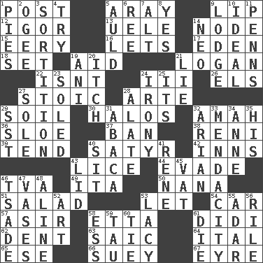 ACROSS 1. Mail 5. Like ___ of sunshine 9. Mouth edge 12. Russian composer Stravinsky 13. Ubangi River tributary 14. Thickened enlargement 15. Suggestive of the supernatural 16. Allows 17. Paradise 18. Arrange properly for use 19. Assist 21. Utah city north of Ogden 22. Is not 24. One more than two 26. Raised railways 27. Unemotional 28. Johnson of "Laugh-In" 29. Land 30. Auras 32. Nursemaid 36. A type of plum 37. Prohibit 38. Painter Guido (1575-1642) 39. Watch over 40. Man with strong sexual desires 42. Taverns 43. Louse (plural) 44. Dodge 46. Federal power corp. 49. Call ___ day 50. Grandmother 51. Vegetable dish 53. Allow 54. Auto 57. SW Saudi Arabia district 58. Singer James 61. "You Light Up My Life" star Conn 62. Scratch 63. Ketch in the Levant 64. Slanted text style (abbr.) 65. Compass dir. 66. Chop _ 67. Jane of fiction DOWN 1. Sliced desserts 2. Double curve, resembling the letter S 3. Determination 4. Attempt to accomplish something 5. Old (Scot.) 6. To sift 7. Keyboard modifier key 8. It is so 9. Cabin 10. Perfect 11. Actor Sean's family 14. Modern: prefix 19. Black tropical American cuckoo 20. Hankering 21. Falsehood 23. Having a sole or soles 24. Literary sarcasm 25. It is 27. Flatfish 28. Having winglike extensions 29. Fast jet (abbr.) 31. Phillipine bananalike plant 32. Believer in; advocate of (suffix) 33. Ananias' fault 34. Singer Murray 35. Part of HMS, perhaps 40. Be seated 41. French philosopher Descartes 43. Hat (slang) 45. Large container 46. Sadhe (variant) 47. Flower holders 48. Place in a line 52. Tate display 53. Made of lace 55. The sixth month of the Jewish calendar 56. Cause heat under the collar 58. Double-curved letter 59. The 19th letter of the Greek alphabet 60. Neckwear 61. Pass on