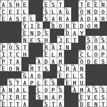 ACROSS 1. American tennis player Robert 5. Eastern Standard Time (abbr.) 8. Adolescent 12. To provide with a ceiling 13. Volcanic refuse 15. Southwest Nigerian state 16. Artist's stand 18. "Two Mules for Sister ____" 19. The sixth month of the Jewish calendar 20. Compete 22. Mood resulting from idleness 24. Conclusions 26. 24 hours 27. Tender 28. Passenger plane 29. Mayday 32. Mail 35. Water falling in drops from the sky 37. Chief or king in Benin or Nigeria 38. Hankering 39. Shade tree 40. Hoof sound 41. Parent Teacher Assoc. 42. First man 43. Lyric poems 44. Age 45. Mountains (abbr.) 46. SW Asia republic 49. E Mali city 50. Snakelike fish 51. Paper fasteners 55. Australian flightless bird 56. Of or related to the anus 57. Chops off 59. Collect or gather 63. Become fatigued 64. Fastener 65. Nights before holidays 66. Singer James 67. R.R. building 68. Gouge DOWN 1. Adept person 2. Ocean 3. Part of HMS, perhaps 4. Veterans Day date 5. Double-curved letter 6. Thick slice 7. Edible starchy tuberous root 8. Sycophant 9. Inside; within (prefix) 10. Dutch treat 11. Or not 14. Place where plants grow 17. Actor's bit 21. Begley and Asner 23. Consume 25. Tears up 28. Stevie Ray Vaughan's brother 29. Disposed of to a purchaser 30. Mitch Miller's instrument 31. Plant excrements 32. Corncob 33. "Beetle Bailey" pooch 34. Examine hastily 36. In the manner of 40. Ingested 42. Ringlike coral islands and reefs 45. Atlas unit 47. Portuguese money of account (variant) 48. _ mater 49. An organ shaped like a helmet 51. In a ____ (agitated or irritated) 52. Small pie 53. Immeasurably long periods of time 54. Argument over a trivial matter 56. Had dinner 58. Health resort 60. "___ Maria" 61. Elected rep. 62. Fast jet (abbr.)