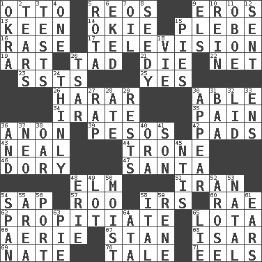ACROSS 1. "Beetle Bailey" pooch 5. Vintage cars 9. Greek god of love 13. Peachy ____! 14. Migrant worker of the '30s 15. Military trainee 16. Raze (variant) 17. Boob tube 19. Tate display 20. Small boy 21. Expire 22. Fish or hair follower 23. Fast planes 25. Affirmative reply 26. Ethiopian city, capital of Harari 30. Competent 34. Feeling or showing extreme anger 35. Ache 36. Soon (poet.) 39. Mexican monetary units 42. Groovy apts. 43. Anneal 44. Marketplace scale 46. Dinghy 47. Before Barbara or Clara 48. Shade tree 51. SW Asia republic 54. Plant excrement 57. Friend of Pooh 58. Big collection agency 60. Actress Charlotte 62. Conciliate 65. Globular water bottle used in Asia 66. Nest on high 67. Comedian Laurel of Laurel & Hardy 68. Austrian river, tributary to the Danube 69. Nathan's nickname 70. Story 71. Snakelike fish DOWN 1. Gumbo ingredient 2. Lacerates 3. Trials 4. Single 5. Roll call or roster of names 6. Supplemented with great effort 7. Petroleum 8. Sleazy 9. Raised railways 10. It's straight from the horse's mouth 11. Mitch Miller's instrument 12. Posted 15. Sliced desserts 18. Compete 20. Russian ruler of old 24. Without thickness 27. Strike 28. Had dinner 29. Musical pauses 30. Seem 31. Sound made by sheep 32. Flaplike covering 33. Followers of ems 36. Added to 37. Modern: prefix 38. Rowing implement 40. Mouth or opening 41. Male child 45. Nuclear Threat Initiatives 48. 4th largest of the Great Lakes 49. Car dealer's back yard 50. Wet 52. Came up 53. Brizilian seaport 54. Connect, as a bridge 55. Type of rug 56. Sweet dark-red dessert wine 58. Slanted text style (abbr.) 59. French philosopher Descartes 61. Hearing organs 63. Sliced dessert 64. "One Day ___ Time" 65. Falsehood