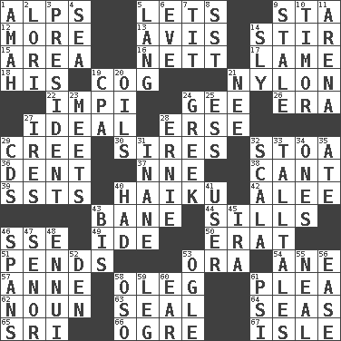ACROSS 1. High mountains 5. Allows 9. R.R. building 12. Greater amount 13. Deliberation 14. Agitate 15. Length times width 16. Remaining after all deductions 17. Unable to walk 18. Part of HMS, perhaps 19. Gear tooth 21. Thermoplastic polyamide 22. Body of Kaffir warriors 24. Turn to the right 26. Epoch 27. Standard of perfection 28. Celtic language 29. Algonquian 30. Begets 32. Portico 36. Incision 37. Compass dir. 38. Patter 39. Fast planes 40. Japanese verse 42. Toward shelter 43. Object of repulsion 44. Beverly of Met fame 46. Compass dir. 49. Binary compound 50. Part of Q.E.F. 51. Hangs 53. Mouth or opening 54. A saturated hydrocarbon 57. Singer Murray 58. Cassini of fashion 61. Entreaty 62. Part of speech 63. Lick closed 64. Oceans 65. Indian title of respect (Mr.) 66. Legendary monster 67. Capri or Wight DOWN 1. Wet nurse 2. Australian parrot (variant) 3. Elected leader of a country 4. Ocean 5. Long (Scottish) 6. Night before a holiday 7. Teat (slang) 8. Fast jet (abbr.) 9. Having lost freshness 10. Southeast Indonesia island 11. Sports stadium 14. Stealthy 19. Accounting whiz (abbr.) 20. Lubricates 21. Born 23. Confronts 24. Of Greece 25. Double-curved letter 27. Angers 28. Bert's buddy 29. Music discs 31. Lacking in sense or substance 32. Any of the three canals of the cochlea 33. Baron Munchausen's specialties 34. Washington bills 35. Had dinner 40. Possessed 41. One who uses or employs something 43. Twice 45. Retirement account (abbr.) 46. Connects, as a bridge 47. Sir (Sp.) 48. World-weariness 52. Lair 53. Stare 55. Actress Patricia 56. Relaxation 58. Bear (Spanish) 59. Part of a journey 60. Hearing organ 61. Air pressure measure (abbr.)