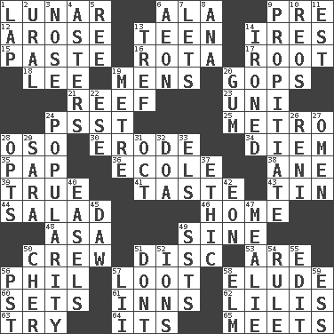 ACROSS 1. Type of eclipse 6. Chicken ___ king 9. Before (prefix) 12. Came up 13. Adolescent 14. Angers 15. Thick mixture 16. Round or rotation of duties 17. Carrot, for example 18. Area sheltered from the wind 19. Not women's 20. Republicans 21. Coral collection 23. Corn or form start 24. Inconspicuous attention getter 25. Paris' subway 28. Bear (Spanish) 30. Eat (away) 34. South Vietnam president (1954) 35. Infant food 36. Learning spot: Fr. 38. A saturated hydrocarbon 39. Loyal 41. Clothes sense 43. Metal container 44. Vegetable dish 46. Dwelling 48. White ___ sheet 49. Trig term 50. Group working together 51. Compact _ 53. "We ___ not amused" (Victoria) 56. Silvers or Donahue 57. Spoils 58. Evade 60. Puts into a specified state 61. Restaurants 62. Ms. Damita and namesakes 63. Attempt 64. ___ a Wonderful Life 65. Confronts DOWN 1. Pet locale 2. Mountain range 3. Olfactory organ 4. Michaelmas daisies 5. To separate or throw off 6. Age 7. Allows 8. Santa ___, CA 9. Conciliate 10. Vintage cars 11. Eastern Standard Time (abbr.) 13. Not kosher 14. Pressed 19. Distance measurement (Brit.) 20. Chewing product 22. Compass dir. 24. Teen's desire 26. Painter Guido (1575-1642) 27. Sign of something about to happen 28. Chooses 29. "Two Mules for Sister ____" 31. Sep. follower 32. ___ good deed 33. Raised railways 37. Value system 40. Artist's stands 42. Period of immesurable duration 45. Fool 47. Ear of corn 49. Fast planes 50. "Mermaids" star 51. Do not 52. Charged particles 54. Governing power 55. Prepare for publication 56. Pacific Standard Time (abbr.) 57. Cards in a Roman deck? 58. Shade tree 59. Curvy letter