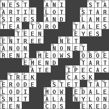 ACROSS 1. Egg locale 5. Black tropical American cuckoo 8. R.R. building 11. Nick name for Arthur 13. Car dealer's back yard 14. Play the lead 15. Titles for men of rank and authority 16. Plus 17. Unable to walk 18. Beverage made from leaves 19. "Corrida" creature 21. Stories 22. Adolescent 24. Sight organs 25. Main course 27. Fish or hair follower 29. At once, immediately (arch.) 30. Music written for nine 32. Painter Guido (1575-1642) 33. Catcalls? 35. Mitch Miller's instrument 39. Make improvements or corrections to 41. Small pie 42. Had dinner 43. Medicinal drug used to evoke vomiting 45. Long journey 48. Keg 49. Eat (away) 50. Proofreading order 52. Make lace 55. Farming town in central California 56. Cut the grass 57. Peak District village in England 59. In a ____ (agitated or irritated) 60. Insect wing 61. Thermoplastic polyamide 62. Car or cant ending 63. Music discs 64. Made supply last DOWN 1. Political cartoonist Thomas 2. One of the Great Lakes 3. Ski resort town in Vermont 4. Make a knot 5. Having or resembling wings 6. Words to Nanette 7. It would 8. Lacking originality or spontaneity 9. Makes less strong or intense 10. Ancient Greek god of war 12. First name in cosmetics 14. Kill 20. Single 21. False hair 23. Bert's buddy 25. Ewer handle 26. Compass dir. 27. Immediately 28. Followers of ems 30. Dreamland 31. Hauls 33. Was introduced to 34. Compass dir. 36. Sass 37. Mouth or opening 38. And so on (abbr.) 40. Cause to be 43. Frozen water 44. Eucharist need 45. Marketplace scale 46. "The Thinker" sculptor 47. Prepare for publication 49. Otherwise 50. Disposed of to a purchaser 51. It was, poetically 53. _ vera 54. Be inclined (to) 56. Big _ 58. Color