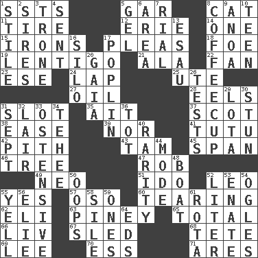 ACROSS 1. Fast planes 5. Slender fish 8. Domesticated feline 11. Hoop that covers a wheel 12. One of the Great Lakes 14. Single 15. Removes the wrinkles 17. Entreaties 18. Enemy 19. Small, flat, pigmented spot on the skin 21. Insect wing 22. Air blower 23. Compass dir. 24. Infant locale 25. Shoshoni 27. Lubricate 28. Snakelike fish 31. Narrow opening 35. Small island 37. Highlander 38. Relaxation 39. Or not 41. Ballerina skirt 42. Heart or essence 43. Scottish cap 45. Connect, as a bridge 46. Family _ (genealogy) 47. Director Reiner 49. Modern: prefix 51. Wedding promise 52. Lion 55. Consenting reply 57. Bear (Spanish) 60. Rending 62. Connecticut Ivy Leaguer 63. Abounding in pines 65. "_____ Recall" 66. 54 in ancient Rome 67. Downhill vehicle 68. Wig 69. Area sheltered from the wind 70. Curvy letter 71. Ancient Greek god of war DOWN 1. Vertical member of a panel or frame 2. Male parents of animals 3. Marketplace scale 4. Posted 5. Set 6. Type of rug 7. Monetary unit of Yemen 8. Java holder (2 wds.) 9. Small Philippine buffalo 10. Adolescent 13. Son of Isaac 16. Grain storage tower 17. Cotton for raincoats, e.g. 20. Greek goddess of the earth (variant) 26. Trials 29. Globular water bottle used in Asia 30. Surprise greatly 31. Back-to-school mo. 32. Den 33. Clearly or manifestly demonstrative 34. Giggle 36. Small child 40. Noteworthy scarcity 44. Method 48. Water vessel 50. I made a mistake 52. 61 cubic inches 53. Related on the mother's side 54. Stares 55. Shout 56. Writer Wiesel 58. Drop; flow; fall 59. Washington bills 61. Round or rotation of duties 64. Begley and Asner