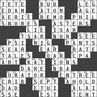 ACROSS 1. False hair 5. Partially opened flower 8. Part of a journey 11. Dutch treat 12. Tiny particle 14. Grow older 15. Nest on high 17. San ____ (Riviera town) 18. Silvers or Donahue 19. Sounds asleep 21. Michaelmas daisies 23. Whopper 25. Austrian river, tributary to the Danube 26. Russian ruler of old 27. Not either 28. Observe 31. 23rd letter of the Greek alphabet 33. Russian fighter aircraft 35. Leg coverings 37. Shrivel 38. Hearing organ 40. Pace 41. Lies 43. Boat paddle 45. Numbers guy (abbr.) 46. Nonscientific branch of learning 47. Krazy ___ of comics 50. Charged atoms 52. Have the gumption 53. Basketball assoc. 54. Speaker 56. Main course 61. Baby bed with high sides 62. Back-to-school mo. 65. Hold, grip (Informal) 66. Male parent 67. Needle holder 68. Jai ____ 69. Compass dir. 70. Eastern Standard Time (abbr.) 71. Portable shelter DOWN 1. Beverages made from leaves 2. Paradise 3. Edible starchy tuberous root 4. Arab leader 5. Drinking establishment 6. Shoshoni 7. Kingdom 8. Cowardly lion portrayer 9. Armor plate that protects the chest 10. Set 13. With motion or animation 16. Snakelike fish 18. For each 20. Thailand, formerly 22. Canvas cover 24. One of the Great Lakes 26. Hoop that covers a wheel 28. Fastener 29. Singer James 30. Compass dir. 31. Lightbulb-shaped fruit 32. Table seasoning 34. E Mali city 36. Curves 37. R.R. building 39. Water falling in drops from the sky 42. Three-handed card game 44. Loose flowing garment 48. Came up 49. Cylindrical with tapered ends 51. Grandmother 52. Small moist lump or mass 54. Mouths or openings 55. Travel on an animal 57. Not this but _ 58. Hero or heavy, e.g. 59. Style 60. Prepare for publication 61. Music discs 63. Fluid product of inflammation 64. Teat (slang)