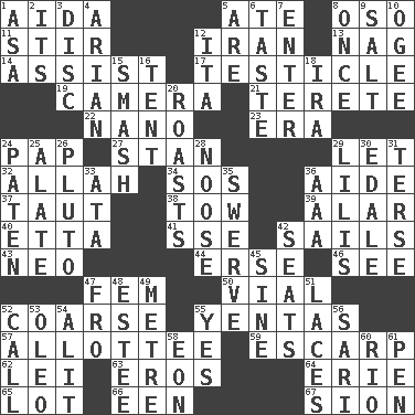ACROSS 1. Opera by Verdi 5. Had dinner 8. Bear (Spanish) 11. Tumult 12. SW Asia republic 13. Tired old horse 14. Aid 17. One of the two male reproductive glands 19. Device for capturing images 21. Cylindrical with tapered ends 22. Billionth: prefix 23. Epoch 24. Infant food 27. Comedian Laurel of Laurel & Hardy 29. Allow 32. Assad's deity 34. Distress signal 36. Helper 37. Pulled tight 38. Pull behind 39. Having or resembling wings 40. Singer James 41. Compass dir. 42. Moves on water 43. Modern: prefix 44. Celtic language 46. Observe 47. Opposite of masc. 50. Small bottle 52. Rough 55. Gossips 57. One to whom something is allotted 59. Fortification 62. Luau accessory 63. Greek god of love 64. One of the Great Lakes 65. Car dealer's back yard 66. Car or cant ending 67. The Jewish people; Israel DOWN 1. White ___ sheet 2. It is 3. Compact _ 4. Believer in; advocate of (suffix) 5. "We ___ not amused" (Victoria) 6. Clothes sense 7. Keyboard key 8. Single time 9. Table seasoning 10. Double curve, resembling the letter S 12. Call ___ day 15. Box-office sellout 16. Portable shelter 18. Retirement account (abbr.) 20. Cooks with dry heat, as in an oven 24. Eucharist need 25. Having winglike extensions 26. Cartoon dog 28. Trap for birds or small mammals 29. Ms. Damita and namesakes 30. Peak District village in England 31. Laconic 33. "One Day ___ Time" 35. Turn aside suddenly 36. American Automobile Association (abbr.) 42. Theater features 45. Trig term 47. From 48. First name in cosmetics 49. Distance measurement (Brit.) 51. Shoestrings 52. Give a ring to 53. Margarine 54. Set down 55. It is so 56. Indian skirt 58. Period of immesurable duration 60. River (Sp.) 61. Writing instrument