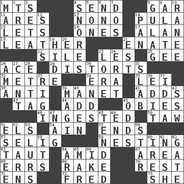 ACROSS 1. Mountains (abbr.) 4. Transmit 8. Slender fish 11. Ancient Greek god of war 13. Words to Nanette 14. Monetary unit of Botswana 15. Allows 16. Singles 17. Actor Alda or Thicke 18. Cordwainer's material 21. Maternal 22. Drop; flow; fall 23. French article 25. Unit of force equal to gravity 26. Adept person 29. What propaganda does 32. Distance measurement (Brit.) 34. Epoch 35. Flowery wreath 38. Against 39. French painter Edouard 41. Does sums 43. Label 44. Find the sum of 45. Off-Broadway awards 46. Swallowed 50. The 23rd letter of the Hebrew alphabet 51. Raised railways 54. The 18th letter of the Arabic alphabet 55. Extremities 57. Former Milwaukee Brewers owner Bud 59. Snuggling 63. Tense 64. Among 67. Length times width 68. Blunders 69. Immoral or dissolute person 70. Repose 71. Followers of ems 72. Flintstone 73. A female animal or person DOWN 1. Shopping center 2. Woody plant 3. Stalk of a moss capsule 4. Sounds asleep 5. A really long time 6. Compass dir. 7. Two (Sp.) 8. POW camp 9. Having winglike extensions 10. Indian princess (variant) 12. Fast planes 14. Baking dish 19. Flintstone garb 20. Connecticut Ivy Leaguer 21. Eastern Standard Time (abbr.) 23. Old wives' tales, e.g. 24. Part of Q.E.F. 26. Nanny (var.) 27. Penny 28. Singer James 30. Is inclined (to) 31. Thick slice 33. Swiss mountan, "Queen of the Mountains" 36. Prepare for publication 37. The content of cognition 39. Wise men 40. Arabian gulf 42. Compass dir. 45. Probability 47. Tired old horse 48. Watched over 49. Compass dir. 51. First name in cosmetics 52. Acquire or gain knowledge or skills 53. Runs notes together 56. Play the lead 58. ___ a Wonderful Life 60. Angers 61. Delicate 62. Yard entry 64. Sandy's bark 65. Third mo. 66. Eisenhower's nickname