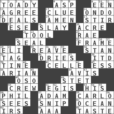 ACROSS 1. Sycophant 6. Viper 9. Car or cant ending 12. Match 13. A slight indication 14. Southwest Nigerian state 15. Allots cards 16. So be it 17. Agitate 18. Compass dir. 19. Kill 20. 1/640 square mile 21. Instrument 23. Actress Charlotte 24. Lick closed 25. Movie unit 28. Connecticut Ivy Leaguer 30. Rob, plunder, or pillage 34. Comedian Laurel of Laurel & Hardy 35. Label 36. Frees from moisture 38. It would 39. Prong on a fork 41. Cell (Danish) 43. Curvy letter 44. Believer in; advocate of (suffix) 46. Opinion 48. Bear (Spanish) 49. Proofreading order 50. Ship's personnel 51. The front part of a cuirass 53. Part of HMS, perhaps 56. Silvers or Donahue 57. First of billions? 58. Monte _, Las Vegas Hotel/Casino 60. Observes 61. Sever or remove by pinching or nipping 62. Sea 63. Big collection agency 64. American Automobile Association (abbr.) 65. Clothes sense DOWN 1. Bit 2. Double curve, resembling the letter S 3. Ancient river in northeast Turkey 4. Erase 5. Affirmative reply 6. _ mater 7. Chop _ 8. Fenced enclosure 9. Pleas 10. Singer Brickell 11. And not 13. Give a ring to 14. Motion picture awards 19. Having a sole or soles 20. Sandy's bark 22. Rowing implement 24. Seigniories (variant) 26. Floor coverings 27. Conclusions 28. Singer James 29. Den 31. Curve 32. Compete 33. Snakelike fish 37. Narrow boards 40. Artist's stands 42. First lady 45. At this time 47. New York city 49. Simple or foolish person 50. "Mermaids" star 51. Pulitzer Prize-winning author Ferber 52. Greek goddess of the earth (variant) 54. Angers 55. Narrow board 56. Air pressure measure (abbr.) 57. White ___ sheet 58. Small bed 59. Single
