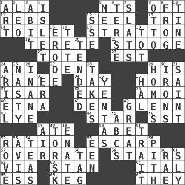 ACROSS 1. Jai _ 5. Mountains (abbr.) 8. Often (poetically) 11. Confederate soldiers (slang) 12. Stitch closed the eyes of (a falcon) 13. Three (prefix) 14. Bathroom plumbing fixture 17. Ski resort town in Vermont 19. Cigar-shaped 21. Moe Howard, for one 22. Carry 23. Eastern Standard Time (abbr.) 24. Cuckoo 27. Gouge 29. Part of HMS, perhaps 32. Indian princess (variant) 34. 24 hours 36. Israeli folk dance 37. Austrian river, tributary to the Danube 38. Supplement with great effort 39. Mine, in Marseilles 40. Inactive volcano in Sicily 41. Lair 42. American astronaut and politician John 43. Potassium hydroxide 44. Play the lead 46. Fast jet (abbr.) 47. Had dinner 50. Collude with 52. Food allowance for one day 55. Fortification 57. Make much ado about nothing 59. Flight of steps 62. By way of 63. Comedian Laurel of Laurel & Hardy 64. Slanted text style (abbr.) 65. Curvy letter 66. Barrel 67. Those things DOWN 1. Tate display 2. Lion 3. "This won't hurt ____!" 4. Small island 5. Was introduced to 6. Laconic 7. Narrow boards 8. Von Bismarck 9. Tree-dwelling hopper 10. Prong on a fork 12. Compass dir. 15. Eat (away) 16. Wig 18. Small child 20. Watched over 24. Satellite of Uranus 25. Offensive 26. Silly 28. Receives possession of 29. Residences 30. Metal shackles 31. Virtuous person 33. Epoch 35. Gossips 36. Actor Linden 42. Relatively large 45. Lettered men learn these first 47. Wind 48. Cod relative 49. Related on the mother's side 51. Distinguishing feature 52. Be footloose 53. Advice 54. Afternoon social gatherings 55. Car or cant ending 56. Essential or central part 58. Label 60. Actress Charlotte 61. Wily