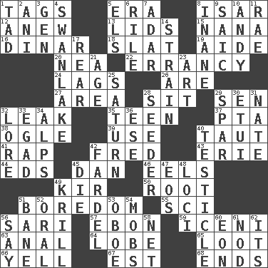 ACROSS 1. Labels 5. Epoch 8. Austrian river, tributary to the Danube 12. Afresh 13. Hats (slang) 15. Nanny 16. Middle Eastern gold or silver currency 18. Narrow board 19. Helper 20. Teachers' org. 22. Tendancy to err 24. Straggles 26. "We ___ not amused" (Victoria) 27. Length times width 28. Be seated 29. Elected rep. 32. Path through which fluid escapes 35. Adolescent 37. Parent Teacher Assoc. 38. Stare 39. Purpose 40. Tense 41. Hit sharply and swiftly 42. Flintstone 43. 4th largest of the Great Lakes 44. Begley and Asner 45. One of the 12 tribes of Israel 46. Snakelike fish 49. Apertif with cassis 50. Carrot, for example 51. Mood resulting from idleness 55. _-fi 56. Indian skirt 57. Inky black, to poets 59. Ancient Celtic tribe of eastern Britain 63. Of or related to the anus 64. Ear part 65. Spoils 66. Shout 67. Eastern Standard Time (abbr.) 68. Conclusions DOWN 1. Small amount or degree 2. Cuckoo 3. Commissioned mil. rank 4. Tchaikovsky ballet 5. Raised railways 6. Cause heat under the collar 7. The sixth month of the Jewish calendar 8. Lacking in sense or substance 9. Ketch in the Levant 10. "60 Minutes" Commentator Rooney 11. Actress Charlotte 14. Put through a sieve 17. Bring up, as a child 21. Personal question 23. Tate display 25. Titan orbits this 28. Sowing specialist 29. Practice fight 30. Needle holder 31. Nathan's nickname 32. Old wives' tales, e.g. 33. Mild oath 34. High mountains 36. Compass dir. 40. A testis 42. Burden 45. Pass on 47. Greek goddess of the dawn 48. Venues 49. The principal food of baleen whales 51. Object of repulsion 52. Relating to the mouth 53. Mitch Miller's instrument 54. Disorderly crowds 56. Declare 58. Fish or hair follower 60. A really long time 61. Lower and raise head in agreement 62. ___ a Wonderful Life