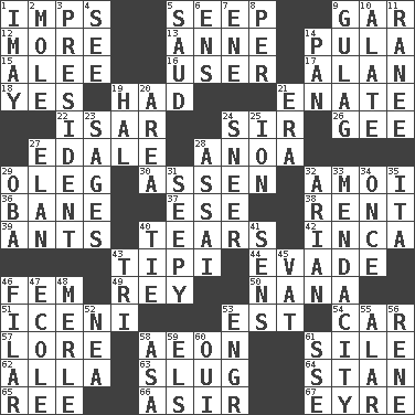 ACROSS 1. Naughty children 5. Ooze 9. Slender fish 12. Greater amount 13. Singer Murray 14. Monetary unit of Botswana 15. Toward shelter 16. One who uses or employs something 17. Actor Alda or Thicke 18. Consenting reply 19. Possessed 21. Maternal 22. Austrian river, tributary to the Danube 24. Title for a knight 26. Unit of force equal to gravity 27. Peak District village in England 28. Small Philippine buffalo 29. Cassini of fashion 30. NE Netherlands city 32. Mine, in Marseilles 36. Object of repulsion 37. Compass dir. 38. Monthly bill 39. Pismires 40. Lacerates 42. South American Indian 43. Native american tent (variation) 44. Elude 46. Opposite of masc. 49. Marina Del _, California 50. Nanny 51. Ancient Celtic tribe of eastern Britain 53. Eastern Standard Time (abbr.) 54. Automobile 57. Old wives' tales, e.g. 58. Period of immesurable duration 61. Filth; sediment 62. Silent film actress Nazimova 63. Strike heavily 64. Comedian Laurel of Laurel & Hardy 65. To separate or throw off 66. SW Saudi Arabia district 67. Jane of fiction DOWN 1. "If ____ say so..." 2. Undercover agent 3. Elected leader of a country 4. Perceive with the eye 5. Saudi Arabian king (1953-1964) 6. Followers of ems 7. Compass dir. 8. For each 9. Russian prison camp 10. Having winglike extensions 11. The wife of a rajah (variant) 14. Baking dish 19. Actor Linden 20. Length times width 21. Period 23. Gurus 24. Contemptuous expression 25. Electrically charged atom 27. Enthusiasm 28. Slender Brazilian palm 29. Chief or king in Benin or Nigeria 31. Not well drained, as in land 32. Believer in; advocate of (suffix) 33. Ananias' fault 34. At one time in the past 35. Call ___ day 40. Standoff 41. Elected reps. 43. Three (prefix) 45. Large container 46. Of or pertaining to a thread or threads 47. Learning spot: Fr. 48. Haggard of country music 52. Teachers' org. 53. Engineer (abbr.) 55. Having or resembling wings 56. French philosopher Descartes 58. White ___ sheet 59. Raised railways 60. Fr. "Yes" 61. Compass dir.