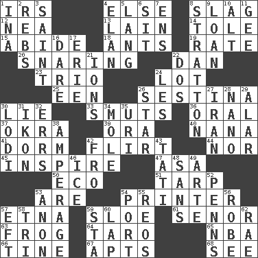 ACROSS 1. Big collection agency 4. Otherwise 8. Volcanic refuse 12. Teachers' org. 13. (Had) reclined 14. Lacquered or enameled metalware 15. Remain 18. Pismires 19. Assign a rank or rating to 20. Catching in a trap 22. One of the 12 tribes of Israel 23. Musical group of three 24. Car dealer's back yard 25. Car or cant ending 26. French poetic form 30. Untruth 33. Particles of soot 36. Relating to the mouth 37. Gumbo ingredient 39. Mouth or opening 40. Nanny 41. Dormintory (informal) 42. Talk or behave amorously 44. Not either 45. Heighten or intensify 47. White ___ sheet 50. Environmental prefix 51. Canvas cover 53. "We ___ not amused" (Victoria) 54. Hard copy producer 57. Inactive volcano in Sicily 59. A type of plum 61. Sir (Sp.) 63. Toadlike animal 64. Pacific island yam 65. Basketball assoc. 66. Prong on a fork 67. Tenement units (abbr.) 68. Observe DOWN 1. _ tizzy (2 wds.) 2. Confederate soldiers (slang) 3. Inhabitant of Heaven 4. Style 5. Austrian-born American filmmaker Fritz 6. Be seated 7. Followers of ems 8. Ski resort town in Vermont 9. Grant temporary use of 10. Keyboard modifier key 11. Unit of force equal to gravity 16. Have the gumption 17. 4th largest of the Great Lakes 21. Charged particles 22. Two (Sp.) 24. French article 26. Play the lead 27. SW Asia republic 28. Billionth: prefix 29. Having or resembling wings 30. Farming town in central California 31. Picture 32. Blunders 34. Undercover agent 35. RI univ. 38. Electrical Measurement 42. From 43. Jacques of French films 46. Frozen water 48. Without 49. Johnson of "Laugh-In" 52. Actor Sean's family 53. Soon (poet.) 54. Left side of a ship or aircraft 55. Vintage cars 56. Loose flowing garment 57. Bank Draft (abbr.) 58. Three (prefix) 59. R.R. building 60. Pet locale 62. Actress Charlotte