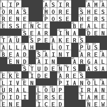 ACROSS 1. Mouth edge 4. SW Saudi Arabia district 8. Housemaid (var.) 11. Mouths or openings 13. Greater amount 14. "______ My Girl" (Turtles hit) 15. French philosopher Descartes 16. Introduce or present, as a question 17. Possessive pronoun 18. Gist 21. Calif. Air Force Base 22. Shrivel 23. _ tizzy (2 wds.) 25. Lair 26. The 19th letter of the Greek alphabet 29. Orators 32. Assad's deity 34. Car dealer's back yard 35. Purulenc 38. Necklace unit 39. Virtuous person 41. Type of rug 43. Conclusion 44. The 18th letter of the Arabic alphabet 45. Therefore, facetiously 46. SAT takers 50. White ___ sheet 51. Make supply last 54. Binary compound 55. Ancient Greek god of war 57. Make or become more lively 59. Player piano 63. Mountain range 64. Central Nebraska county 67. SW Asia republic 68. "You Light Up My Life" star Conn 69. Celtic language 70. Not wild 71. Compass dir. 72. On the rocks 73. ___ Haven, CT DOWN 1. Old wives' tales, e.g. 2. Angers 3. Baking dishes 4. Electrical Unit 5. "Barney Miller" actor Jack 6. Big collection agency 7. To sift 8. At or in the front 9. Haggard of country music 10. NE Netherlands city 12. Perceives with the eye 14. A female animal or person 19. Tender 20. Head covering 21. Oblong piece of solid material 23. Image 24. Remaining after all deductions 26. Bar bill 27. Toward shelter 28. ____ Bator, Mongolia 30. Place in a line 31. Coast Guard woman 33. Sums up 36. Capital and largest city of Mongolia 37. Oceans 39. Saudi Arabian king (1953-1964) 40. Helper 42. In the manner of 45. Toward the sea 47. Shallow baking pan 48. Slept 49. Three (prefix) 51. Evade 52. Japanese brewing company 53. Dodge 56. In a ____ (agitated or irritated) 58. Connecticut Ivy Leaguer 60. NW Algerian seaport 61. Unable to walk 62. Afresh 64. Luau accessory 65. The grampus (Milton) 66. Purpose