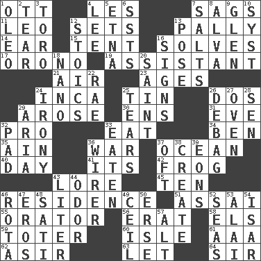 ACROSS 1. Baseball player Mel 4. French article 7. Droops 11. Lion 12. Puts into a specified state 13. Chummy 14. Ewer handle 15. Portable shelter 16. Finds the solution 17. U. of Maine site 19. Helper 21. Wind 23. Ripens 24. South American Indian 25. Metal container 26. Two (Sp.) 29. Came up 30. Followers of ems 31. First lady 32. Adept person 33. Erode 34. Benjamin's nick name 35. The 18th letter of the Arabic alphabet 36. Armed conflict 37. Sea 40. 24 hours 41. It is 42. Toadlike animal 43. Old wives' tales, e.g. 45. "___ Little Indians" 46. Home 51. Slender Brazilian palm 55. Speaker 56. Part of Q.E.F. 58. Raised railways 59. Carrier 60. Capri or Wight 61. American Automobile Association (abbr.) 62. SW Saudi Arabia district 63. Allow 64. Title for a knight DOWN 1. Butter sub 2. Pull into pieces 3. "Corrida" creature 4. Area sheltered from the wind 5. Inactive volcano in Sicily 6. Fast planes 7. Table seasonings 8. Inventor's middle name 9. Small, secluded valley 10. System (abbr.) 12. Unemotional ones 13. Introduce or present, as a question 16. Attaches a signature 18. Billionth: prefix 20. Virtuous person 22. Actress Charlotte 24. Literary sarcasm 25. Pulls into pieces 26. Debunk (Brit. slang) 27. Baking chamber 28. Elected rep. 29. Operatic vocal solo 32. Groovy apt. 33. Ingested 36. One who wires 37. Often (poetically) 38. Cause to be 39. Immeasurably long periods of time 43. 61 cubic inches 44. Scent 46. Roll call or roster of names 47. Greek god of love 48. Suttee (variant) 49. To provide with a ceiling 50. Celtic language 52. Oceans 53. Jai ____ 54. Austrian river, tributary to the Danube 57. Keyboard modifier key